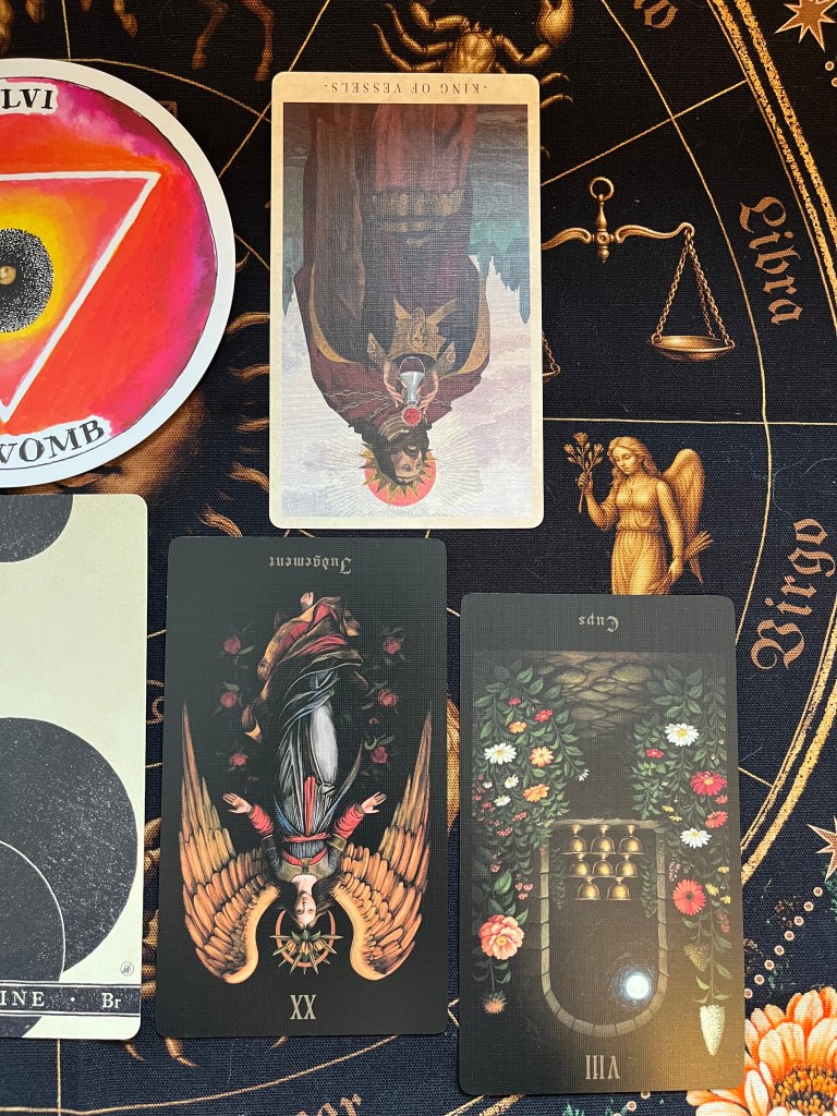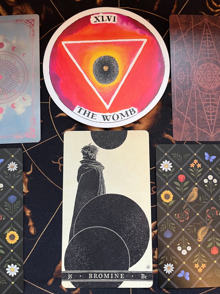 Ah, The Womb. This is a card that has a tendency to pop up for me. I personally think of it as “The Source”, its that thing that ties all living things and non-living things together, a place where we came from, where our mothers came from, and their mothers, and mother earth. Its about holding a sacred space, and understanding that when we deviate from our spiritual/moral source, things are out of balance.