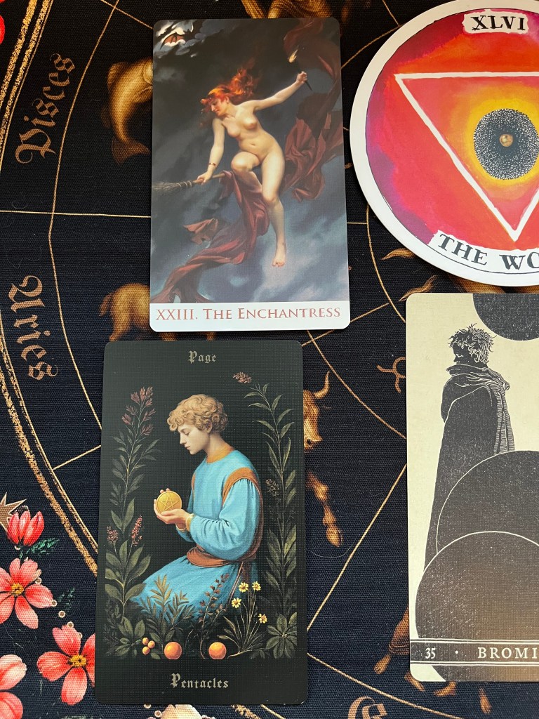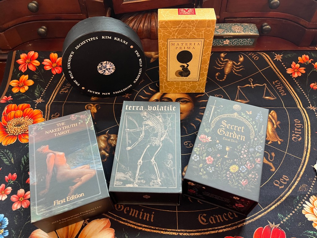 The Terra Volatile with its entire fifth suit of Vessels dedicated to “Quintessence,” and its general alchemical vibe seemed a no-brainer companion to Materia Prima. Though I’m far from able to say I know Terra well, I do feel comfortable using it now after extensively studying it last year. I also wanted to bring The Naked Truth Tarot, is a deck I had since its Kickstarter twoish years ago, but never formally included in a monthly decks. This is a cheeky deck of mostly nude paintings is pretty “Elemental” in it’s unabashed portrayal of people. While it is RWS, it also has very clever takes on the traditional card meanings and it’s just a very beautiful deck. The Secret Garden, an absolute lux deck with plenty of accompanying Kickstarter rewards is really fitting my mood as I wrap up the historical fiction novel The Column of Burning Spices, a book about Hildegard von Bingen. This deck centers around very stoic historic figures with dramatic dark backgrounds and brilliant flower motifs. It’s serious, beautiful, and has a historic apothecary garden feel that matches the rather dark mood in the rest of the decks. And finally, The Wild Unknown Archetypes oracle is no stranger in my collection and has been around for a while on this blog. But, it does feel very primal and elemental in its imagery and Jungian themes.