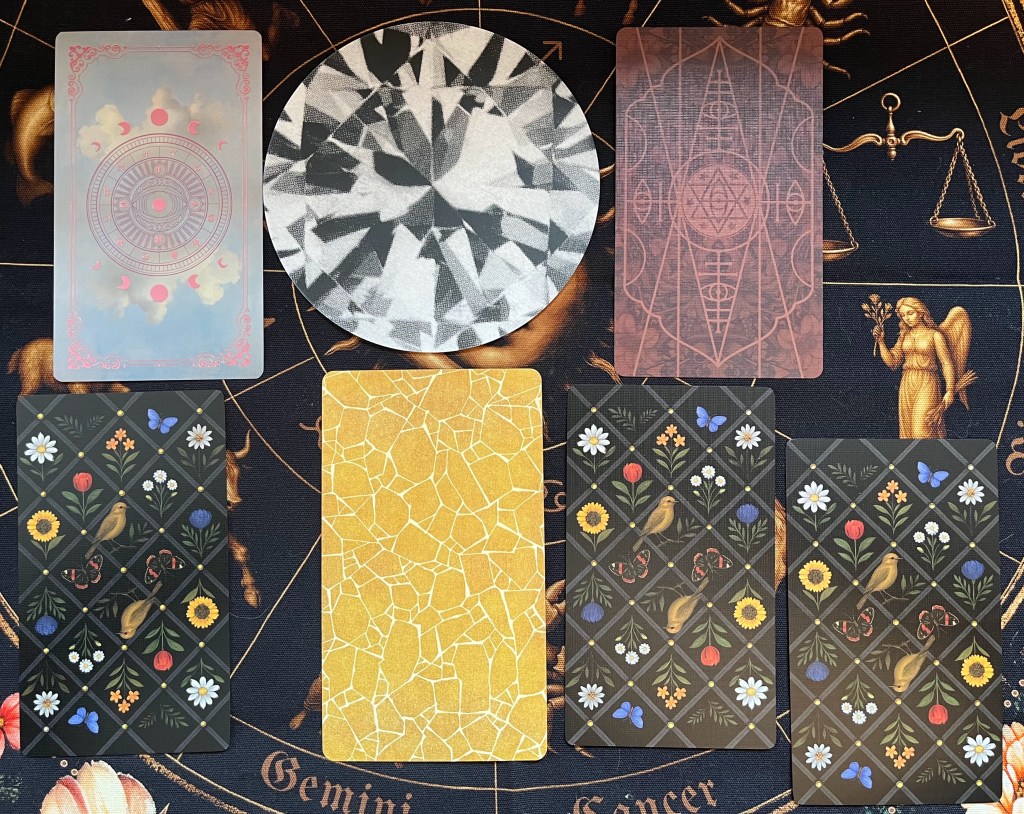 So, full disclosure, I had a totally different draw organization intended for this month, but the Secret Garden Tarot had other plans and very clearly spat out one card that landed face up on the left and two cards face down on the right. It seemed quite purposeful so I decided to let it be and draw my other cards around these three.