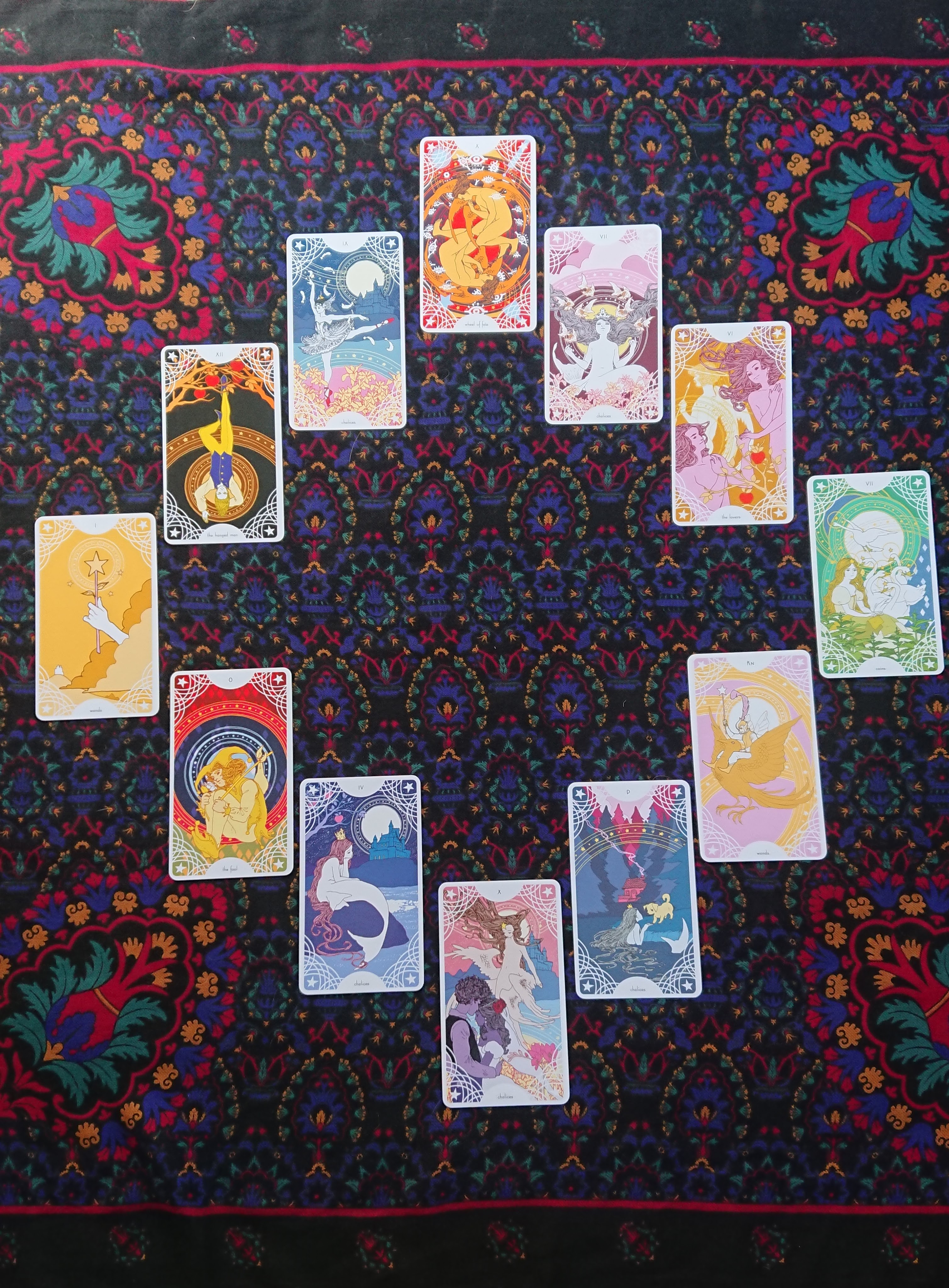 Draw suggestions: Lay out the draw in a circle. Like a clock, place the first card on the one o’clock space position, second card in two o’clock, etc.