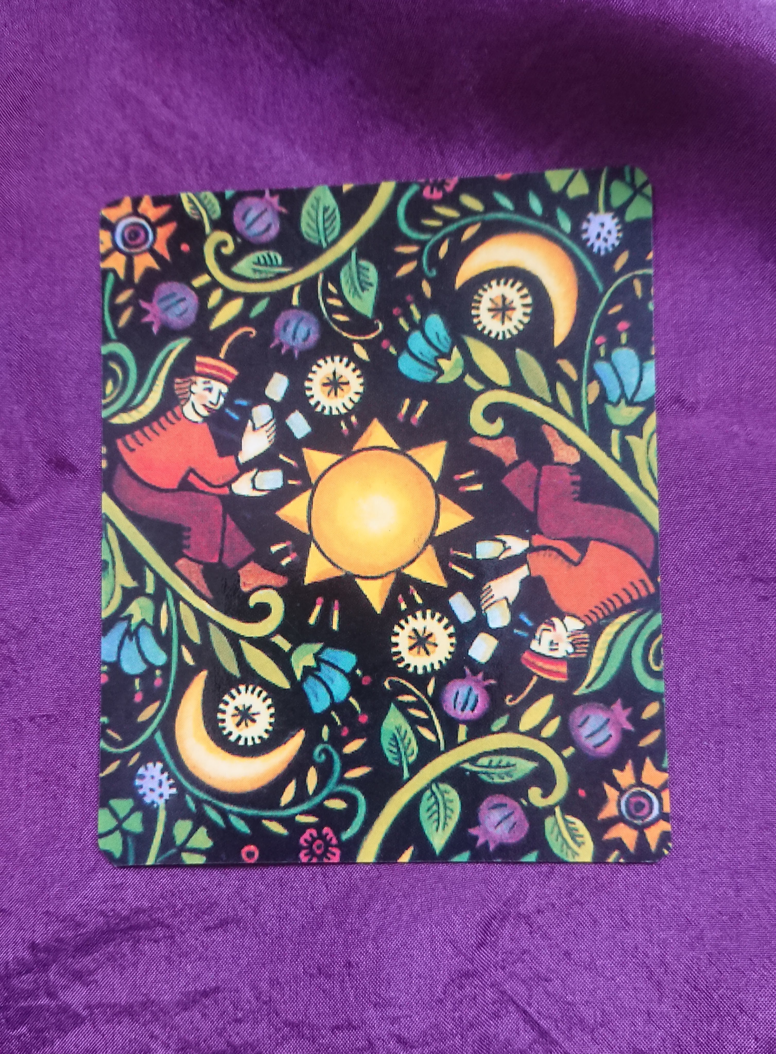 Art: 4/5 I actually have learned to really like this folksy art style. The images are very simple with bright colors, and the backs are GORGEOUS! Some of the more non-traditional images are delightful to sit with and see where your intuition takes you, other cards I simply just don’t “get.” I will admit that I’m really fond of the backs of these cards!