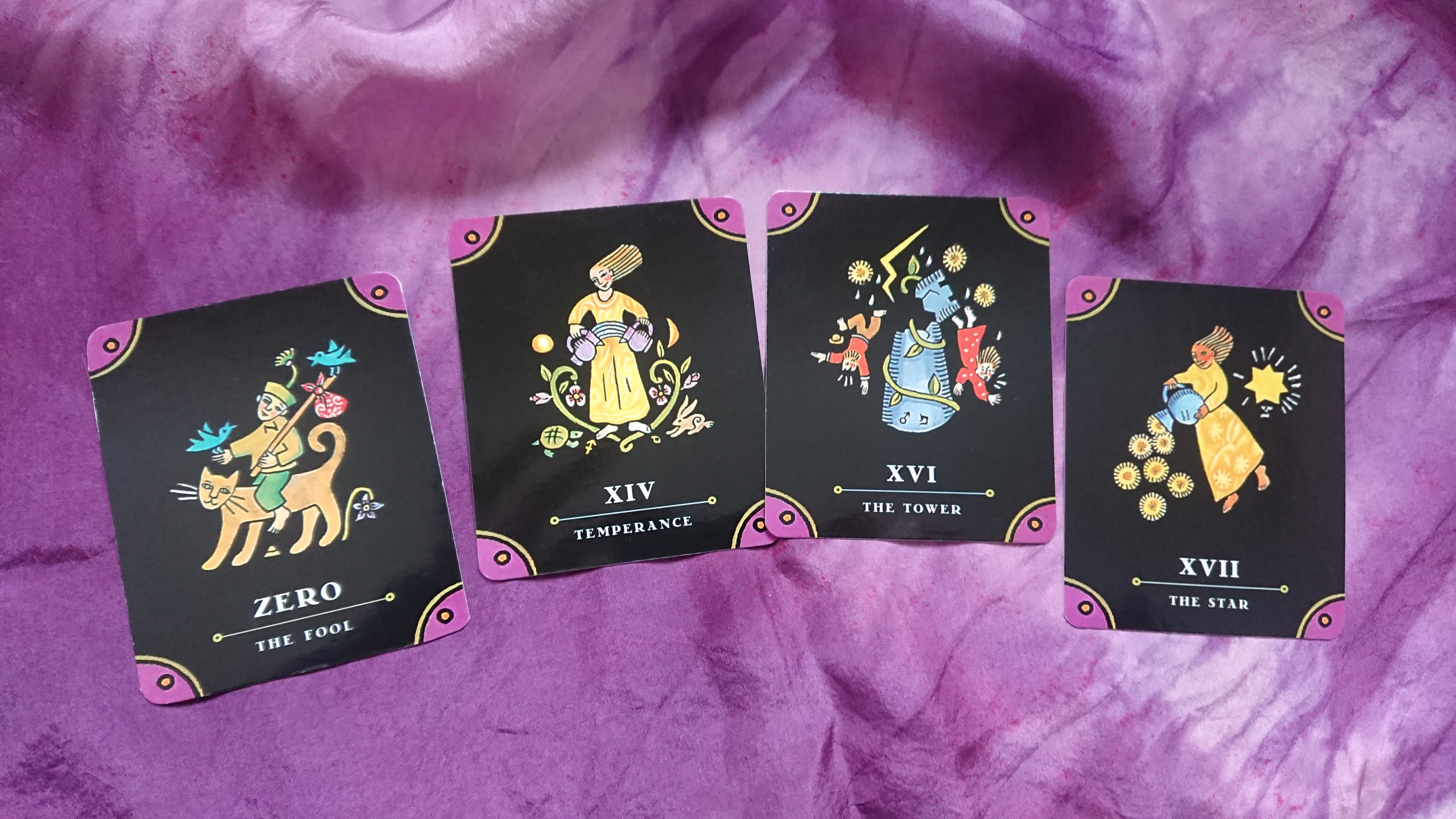 You can see here some cards are very RWS reminiscent (like Temperance and The Tower) and others are completely doing their own thing (The Fool and The Star)