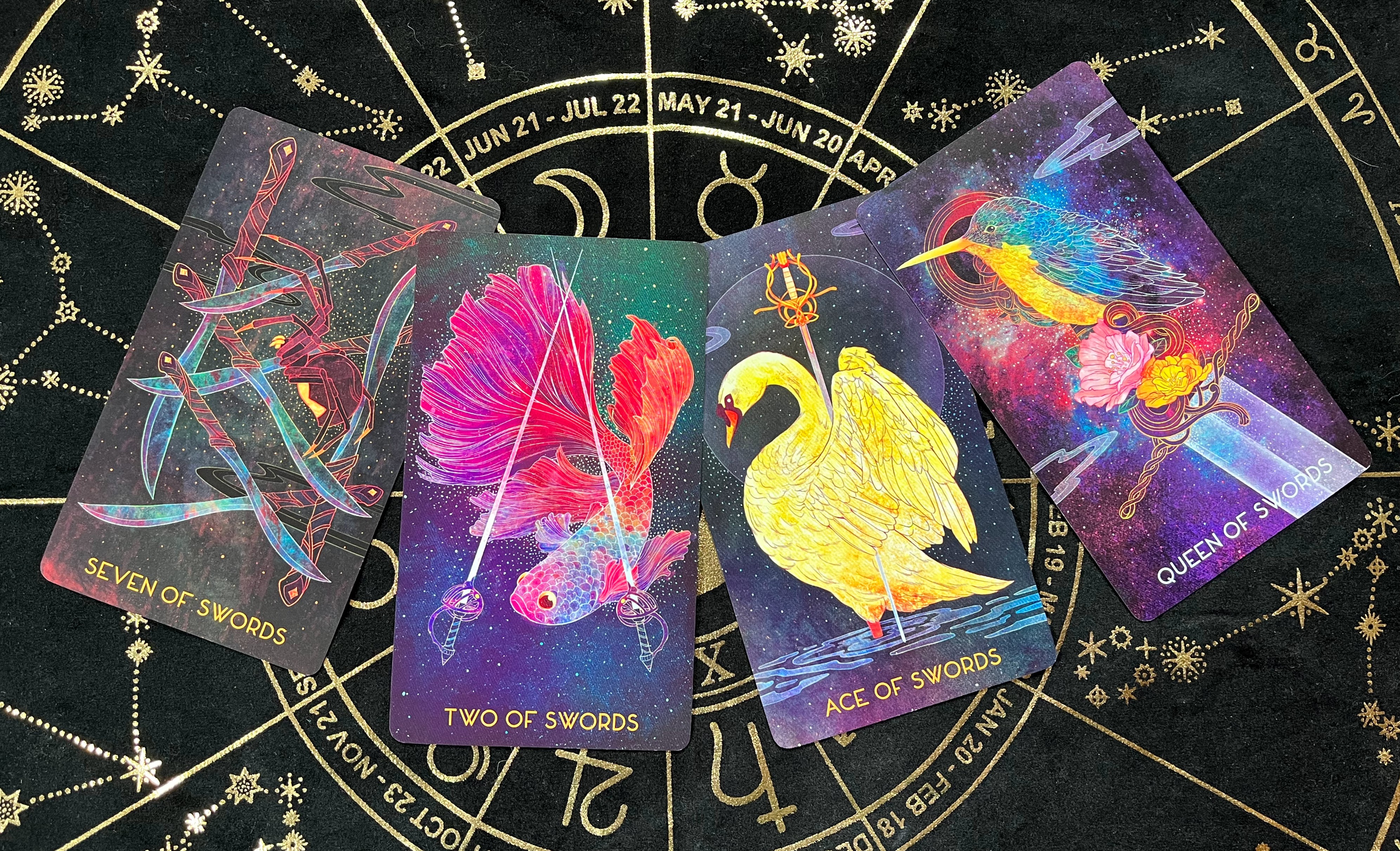 Overall: 10/10 Animals (that the artist thoroughly researched that actually make sense with the meaning of the tarot card)? Cosmic aesthetics? Compass Rose? Vivid colors? Crazy details? HOLOGRAPHIC EDGING???? F*CKING REALISTIC AMAZING SWORDS SUIT?????! Holy Kraft Macaroni and Cheese, was this deck made for me? For a person who actually is very scientific/logical minded and maybe a little emotionally stunted, this is a 10/10 deck. For people who love animals, and looking for animal spirit guides in tarot form, this might not resonate with you because the meaning of the cards are really tied to the animals biology rather than human cultural meaning. We’ll talk more in a sec.