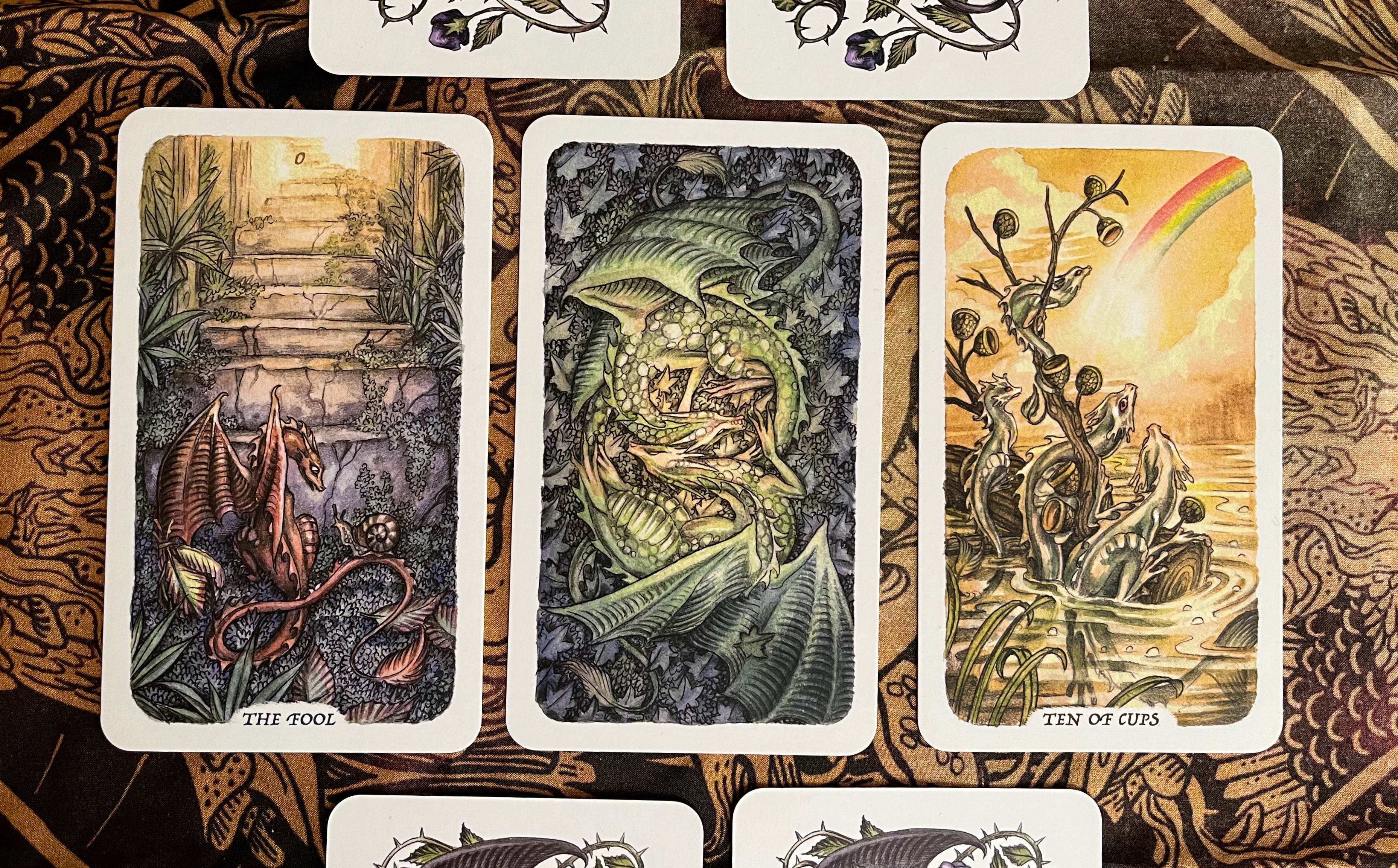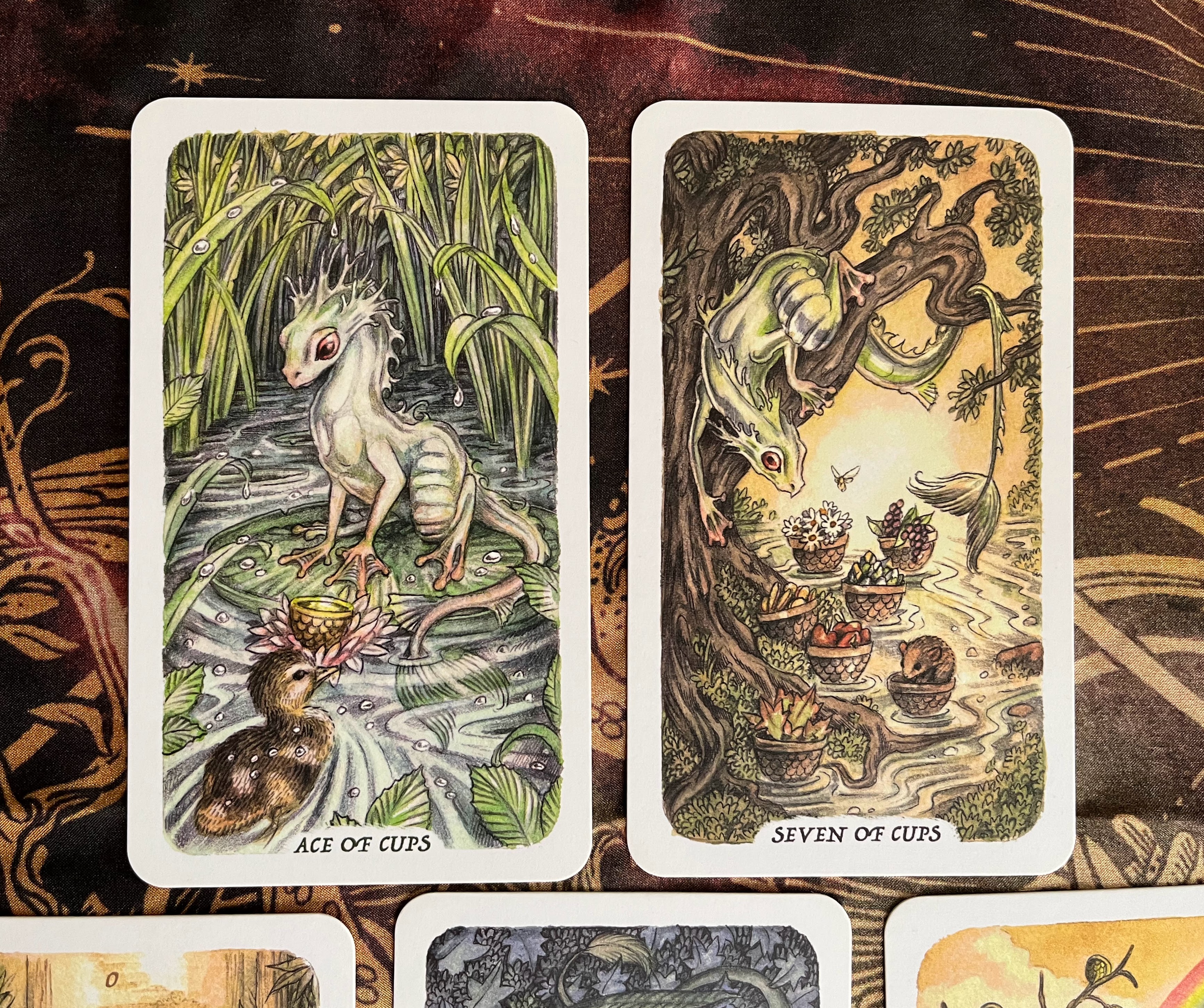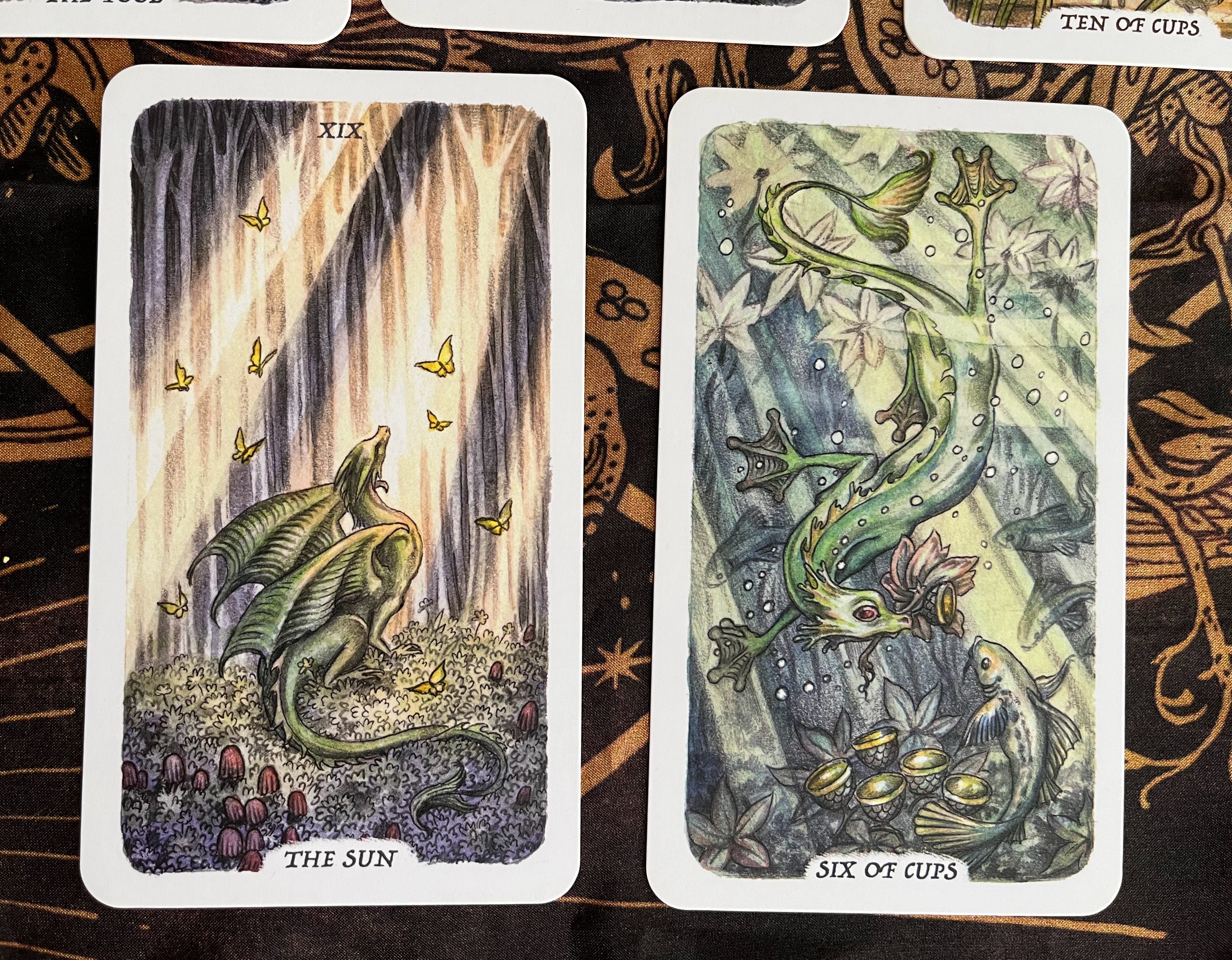 Now, the unnamed card made it’s first appearance in a drawing. I was beginning to wonder if it’d ever pop out. In Three Tree’s Tarot’s first deck, Oak, Ash & Thorn, the extra card was called “Possibilities,” I believe. This card, of two twin dragons sleeping coiled together, looks like they are still dreaming of possibilities. Tomorrow, you’ll dream of new possibilities, new ideas, together with the one you love.