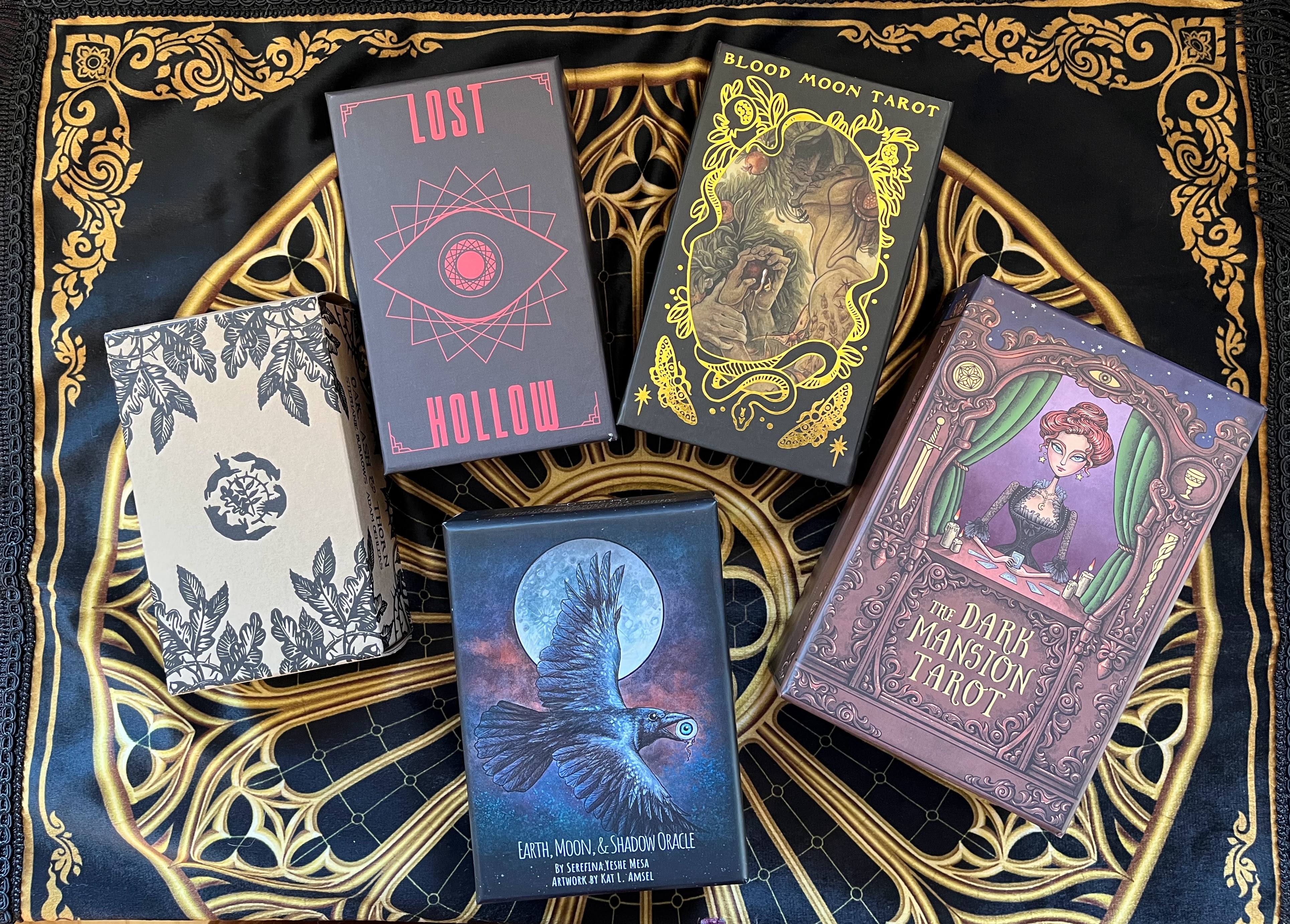 Clockwise starting from top left: Oak, Ash & Thorn tarot, Earth, Moon, & Shadow Oracle first edition, The Dark Mansion Tarot large size edition, Blood Moon Tarot, Lost Hollow tarot