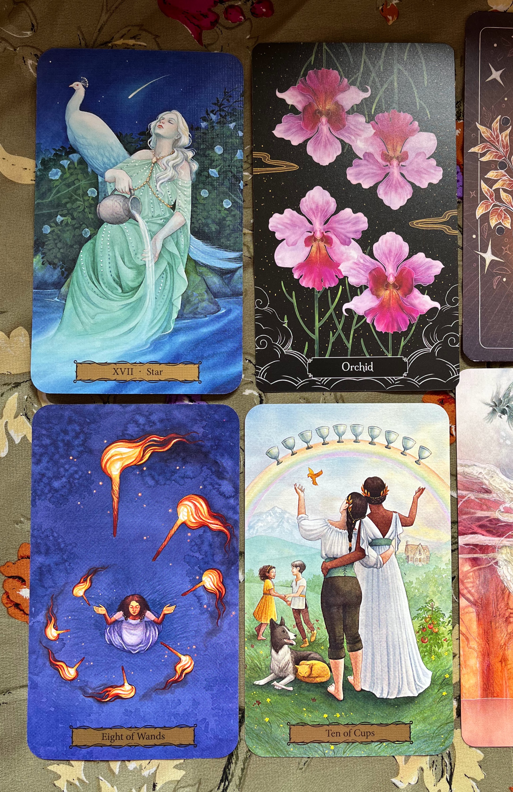 Last year when I took out A Little Rain for my monthly decks I also drew The Orchid, a card speaking to the power of social network and cultivating symbiotic relationships. Well, here it is again! Because I’m not as well versed in the plants featured in ALR, I find this deck a bit more difficult to use, but I’m determined to learn from it and use it because it is one of my most beautiful decks I own!