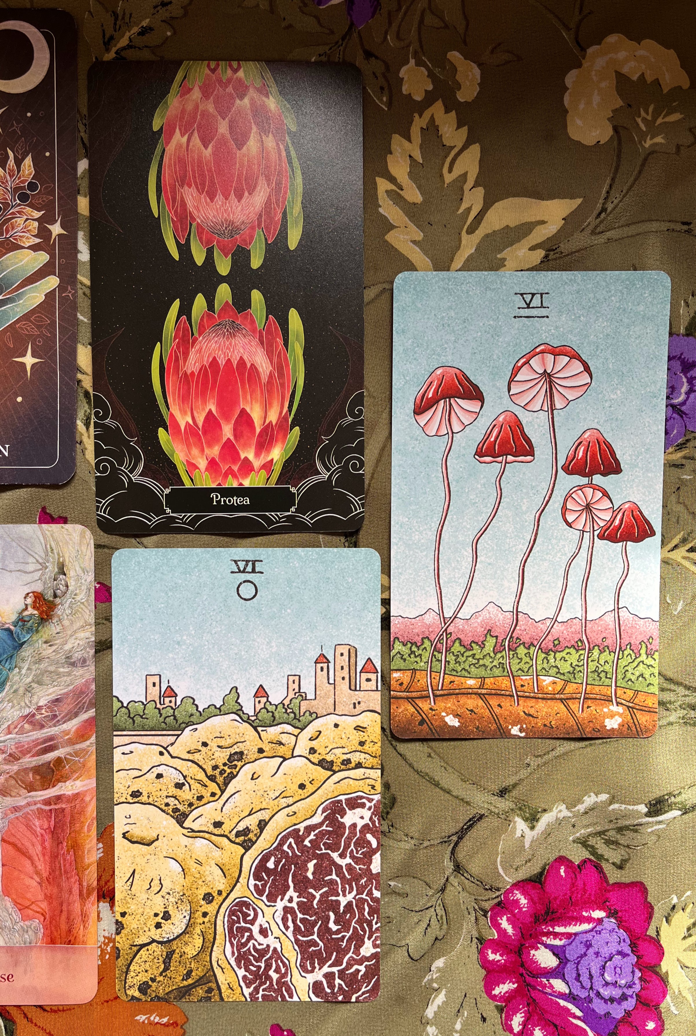 Okay, I’ll admit that I don’t often pick up The Mushroom Hunter’s Tarot, but when I do it always makes me laugh! It is certainly a niche deck (I mean, you gotta like wild mushrooms), but it’s also incredibly playful! I read these cards left to right, that is the order they popped out of the shuffle.