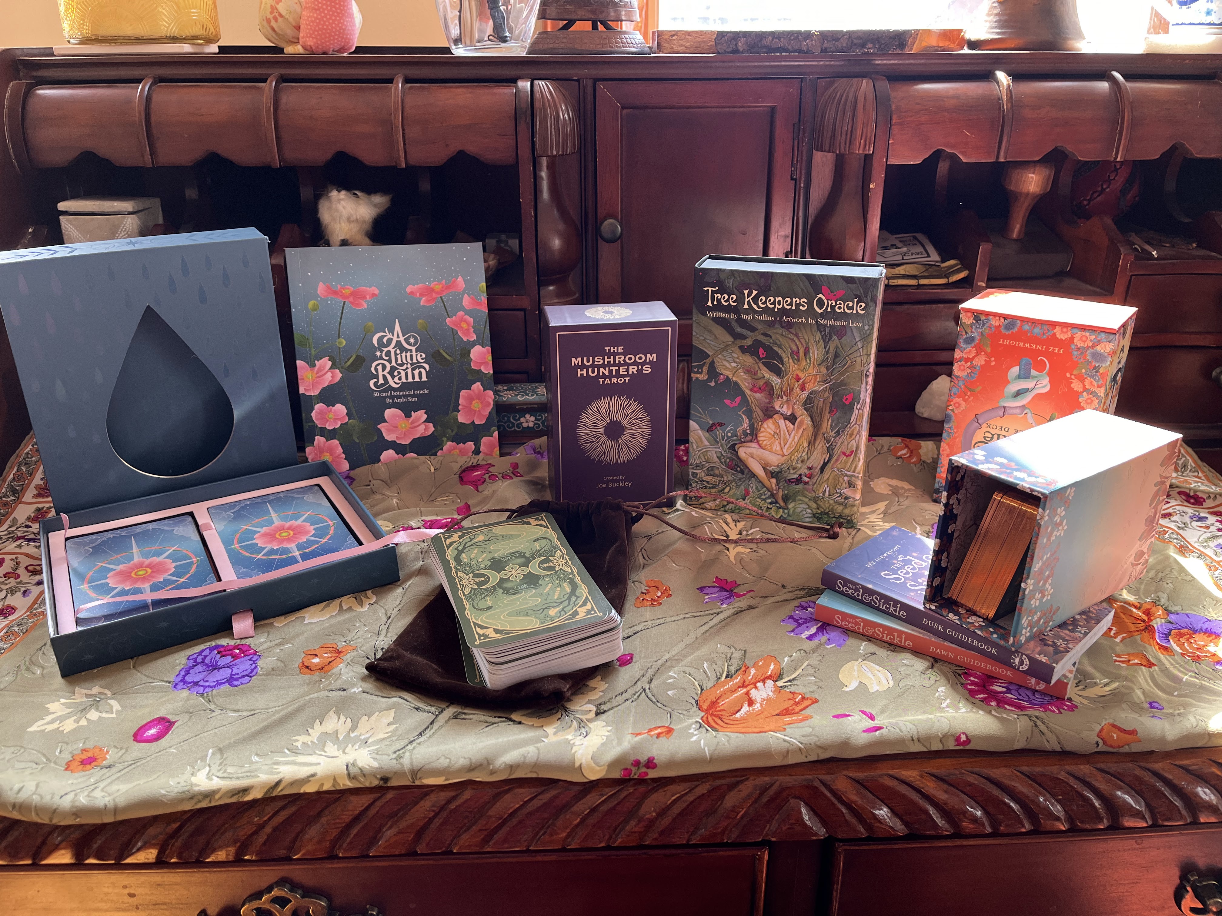 Clockwise: Tarot of the Witch’s Garden, A Little Rain Oracle, The Seed & Sickle Oracle, The Mushroom Hunter’s Tarot, Tree Keepers Oracle