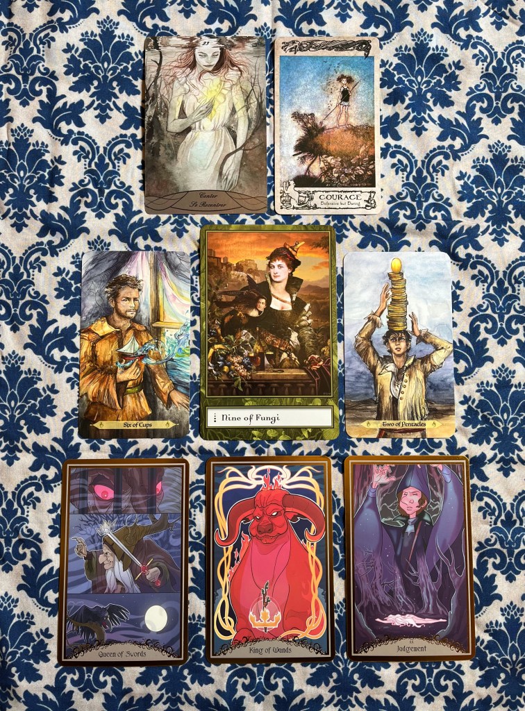 From Boadicea’s Tarot I drew the positively overwhelming Nine of Fungi (Pentacles). This jaunty woman has what looks like a golden chanterelle as a hat–one of the most delicious mushrooms you can find! In one hand she has a man-hawk and in the other what looks like an auto-man heart. Full disclosure, I have not read the book though I do have it. This is a rare exception of a deck I want to fully explore on my own before I get the artist’s vision! But in the meanwhile I may be wrong in the imagery. Oh well; I’m having fun with it! Anyways, she has quite the fruit and wine table spread with a walled fortress town behind her. Oh and she looks like a complete badass to boot! The nine of pentacles this past month has been stalking me in my draws so I’m not surprised to see it again. You have got it all–now what are you going to do with it?
