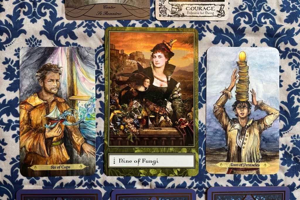 Our Nine of Fungi is flanked by Echos’ Six of Cups and Two of Pentacles. What two very interesting takes on these cards! I love this deck. In this Six of Cups I see a long lasting (perhaps childish?) dream of adventure, but now the means are at hand! The sea is right there, calling to the man from his window! Something you’ve longed for and perhaps even have forgotten is nigh! All you need to do is step outside your door and have the courage to go get it!