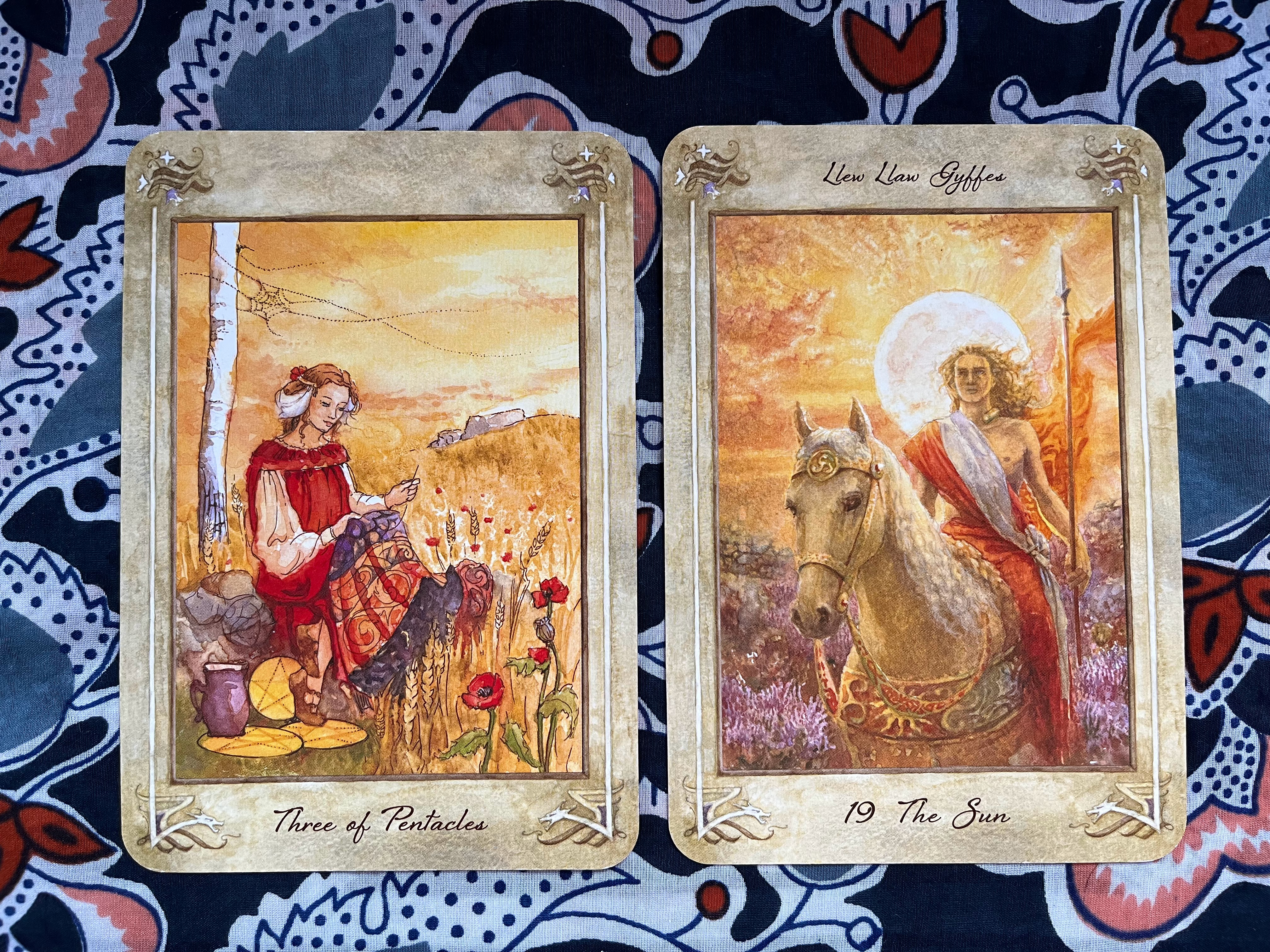 Readability: 3/5 The images of the minors more or less follow the RWS system even if the images deviate from the original RWS. But, while some of the majors are true to the RWS, just as many are not and you will definitely need to refer to the book unless you are already well versed on Welsh mythology. This can be a set back to picking up this deck and running with it. However, the majors have the mythological story or character name printed on the card which is then explained in the MASSIVE guide book which is PACKED with lore and just good Tarot writing and advice.