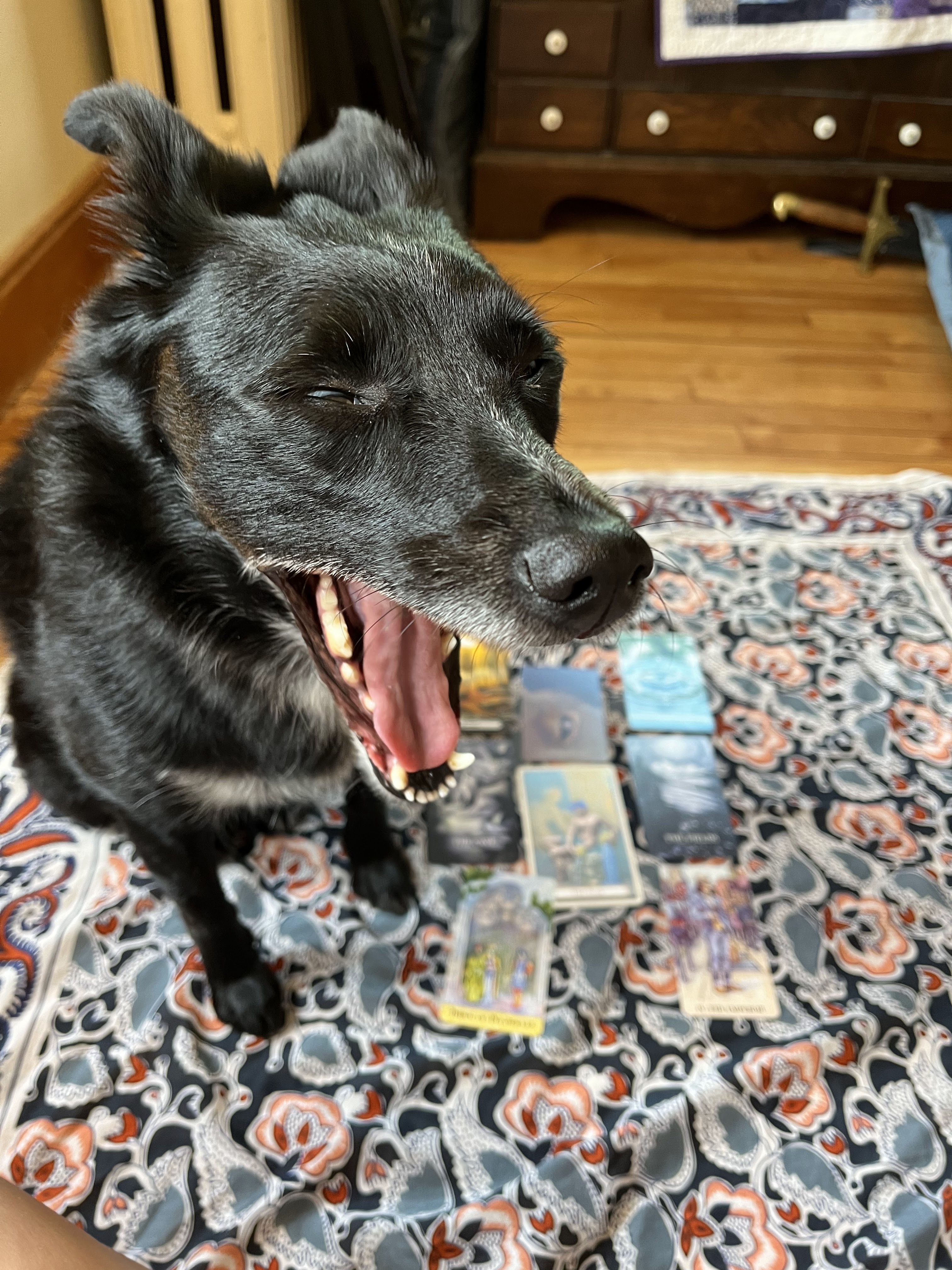 If you ever wonder if I’m incapable of making the tarot cards straight in the images…you are correct. I am incapable! But, my office “helpers” don’t exactly make it any easier, though they do have a great sense of humor!