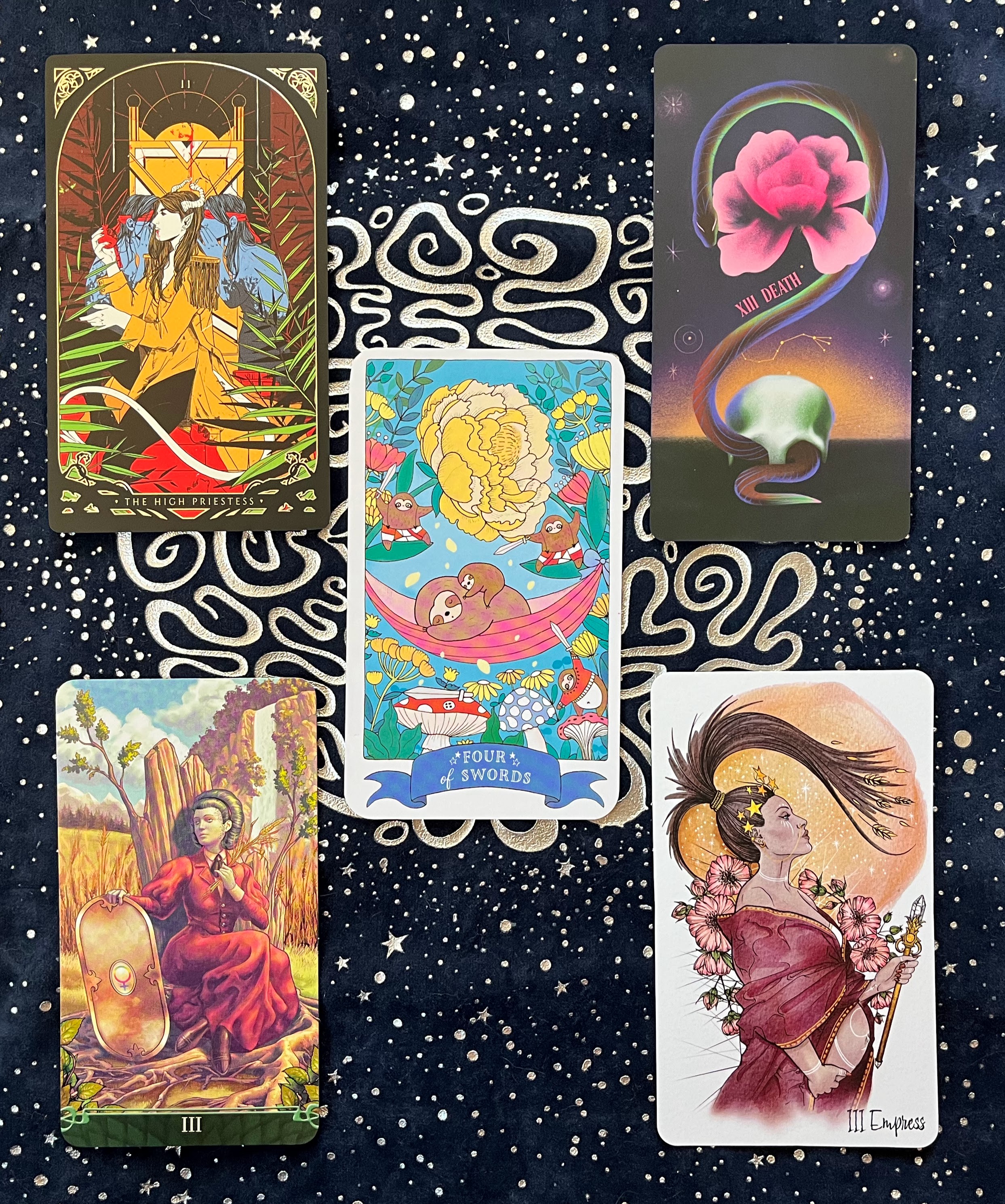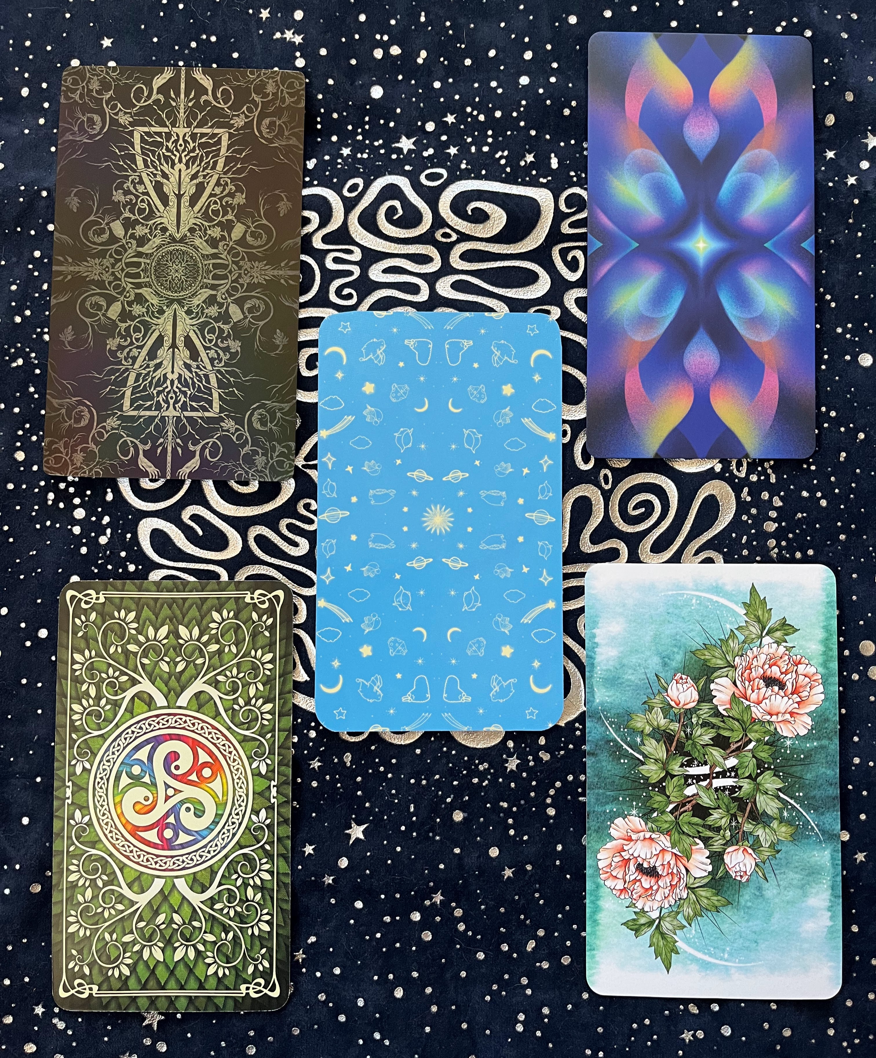 Clockwise: Corrupted Tarot, Dream Visions Tarot, The Unfolding Path Tarot, Tarot at the End of the Rainbow, center Kawaii Tarot