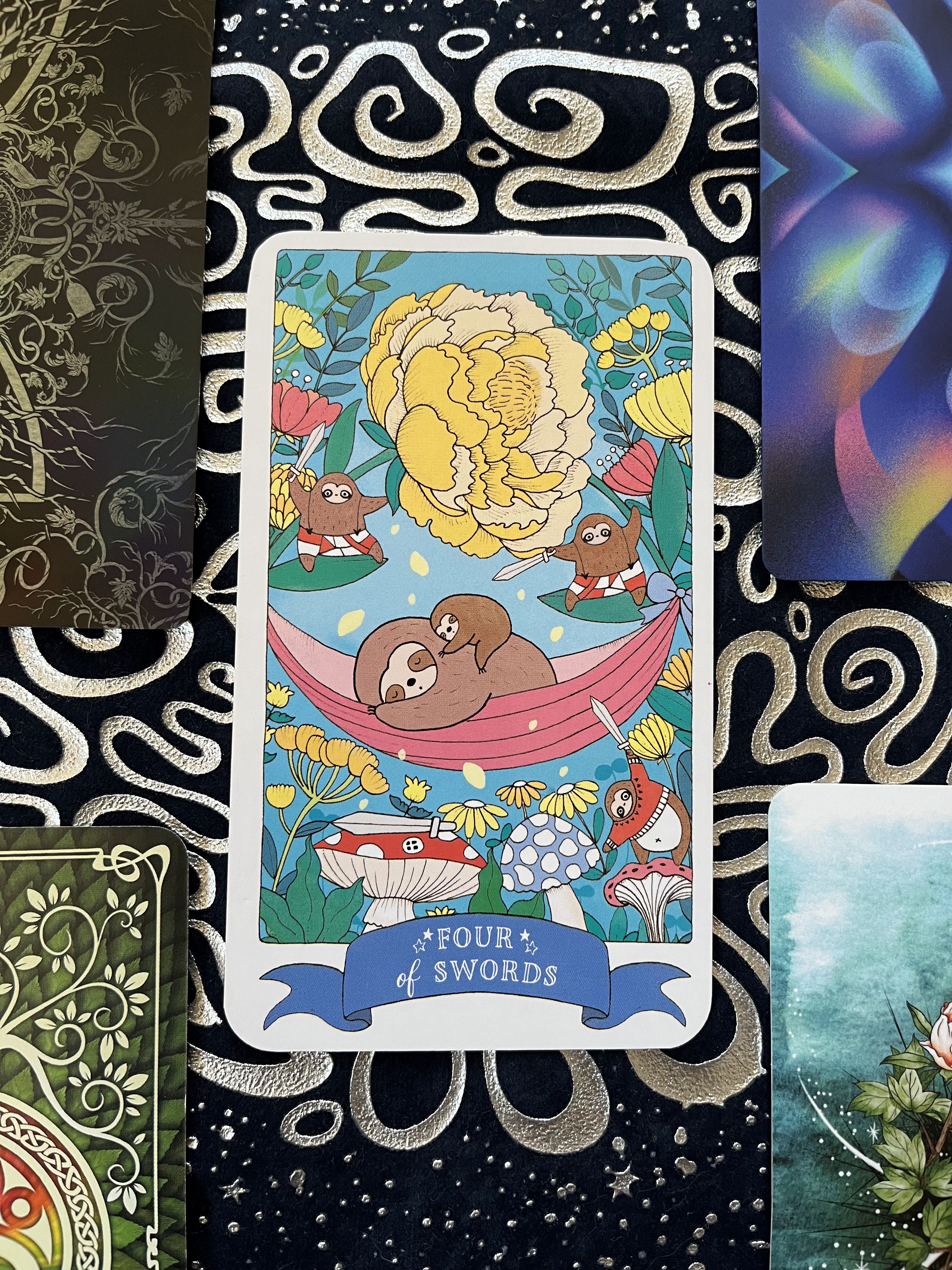 So, I am mirroring the draw I did with my chosen decks for the beginning of this month with Val’s decks now for the later half! The too cute Kawaii Tarot gave me the Four of Swords. Our mama sloth has her work cut out for her! She needed a break, to rest and enjoy the flowers and take a step back from the little sloths’ shenanigans! Yes, indeed I had a quantifiable very-much going on this early September that suddenly came to a halt. Many things I’ve been toiling at have reached their conclusion and now I can sit back and enjoy the fruits of my labors (or really, take a effing nap!).