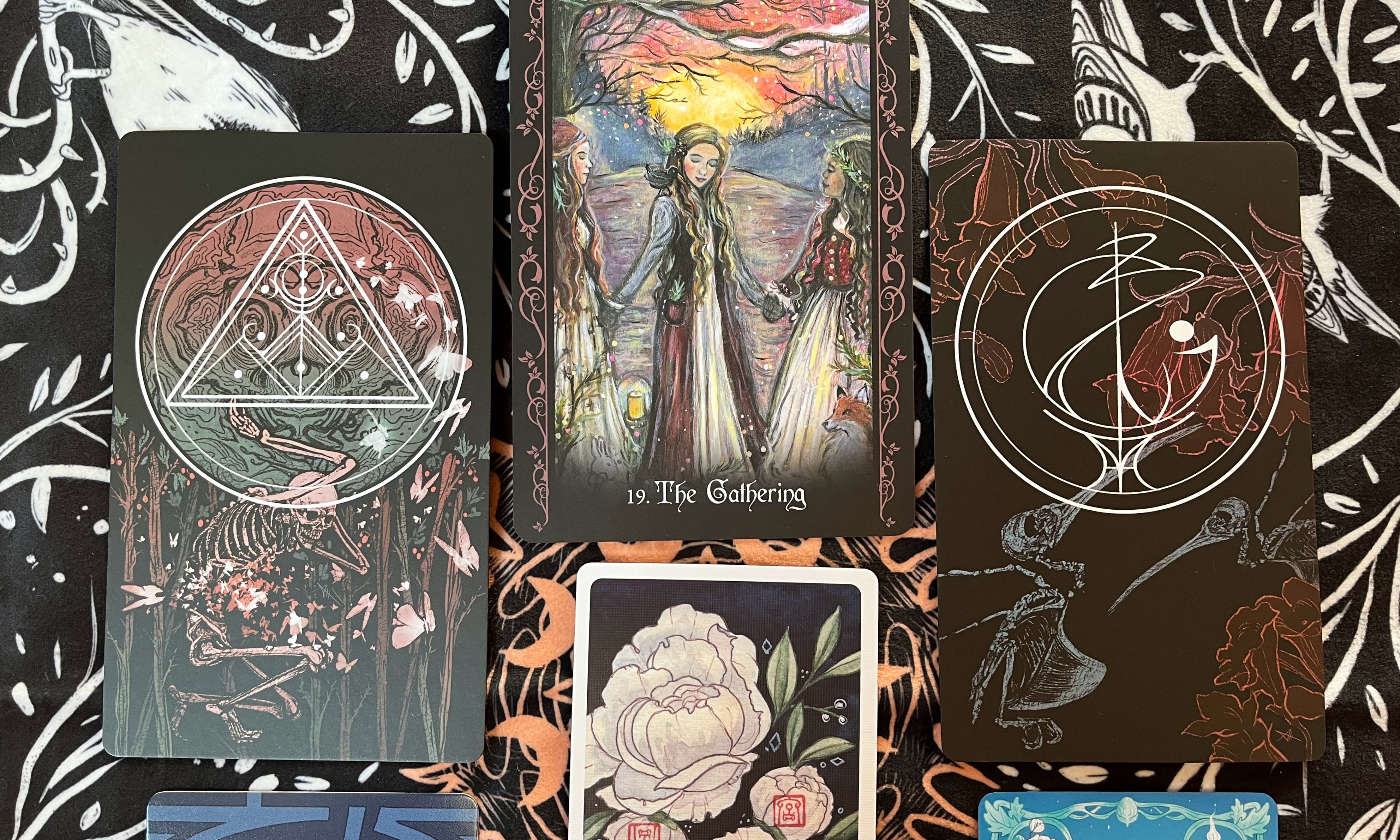 So, October in my neck of the woods definitely has a vibe to it—not only is my particular neighborhood really invested in Halloween, it also has quite a large population of Wicca and Pagan practitioners, many of whom celebrate Samhain with vigor. One would be hard pressed to not want to get into the spooky feel of things! The weather in October typically starts to go from the balmy early fall to really cold, really quick. This sudden change often coincides with fantastic leaf colors (and don’t get me wrong, we’re getting fantastic colors this year!) and the desire to get cozy. However, as I finally get around to writing this monthly deck draw, it’s a sweltering 80F something in my office and we are maybe thinking of getting cooler in a few days. Maybe.
