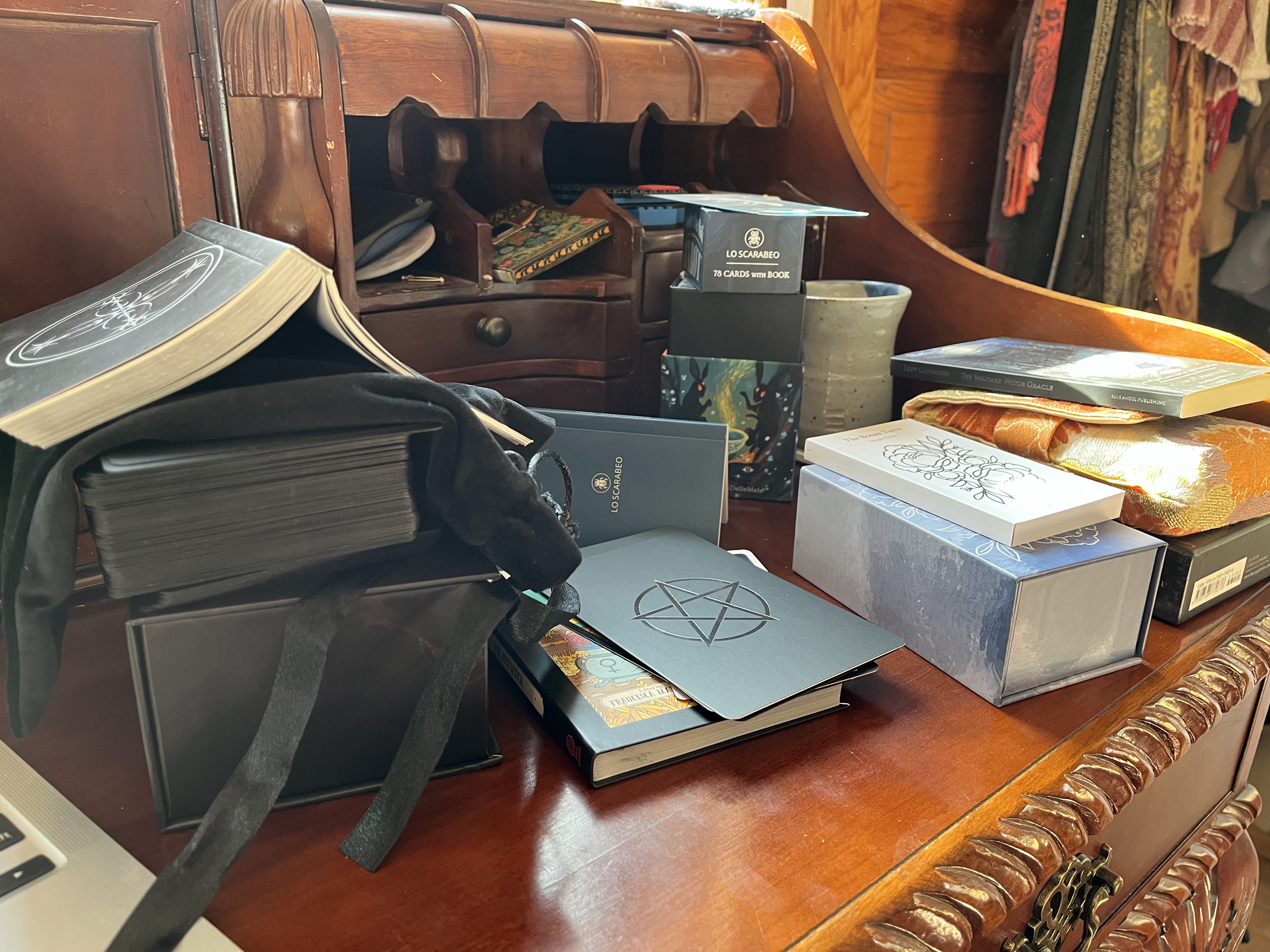 From left clock wise: Ask The Witch Tarot, The Botan Tarot (second edition), The Nameless One Oracle and Tarot, Under the Oak Tarot, The Solitary Witch Oracle