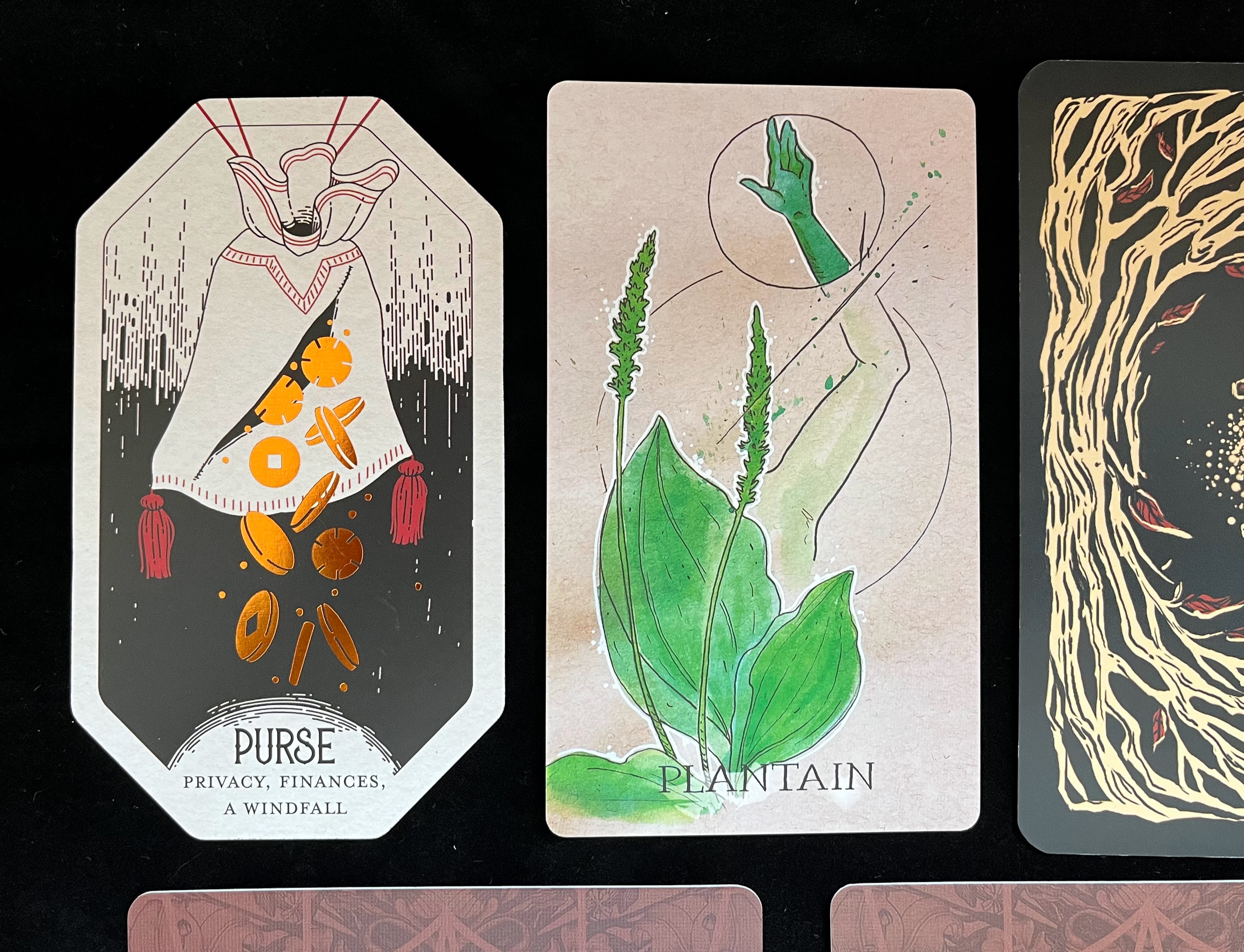 Alright, we open with a bit of mystery! Interestingly, the first thing I notice is how there is a cut in both images. The purse has been cut (ah-hem, cut-purse? like a thief?), but the plantain is also showing a cutting wound. With the purse, we speak of what is of value to us, where do we put our efforts and money? What is hidden but also has value? The key words also suggests an unexpected windfall. The Plantain is a plant I typically think of as a noxious weed (I mean, where I live it is, often called “White-Man’s Foot” for it vigor in disturbed soils) but the amazing booklet explains that it is a plant of healing, but unusually so because it pulls out that which is unwanted, toxic, and harmful. A keyword with this card is rejection, but with a twist of YOU yourself rejecting something bad for you in order to heal. Huh. So a kind of “cut” or wound which is a windfall and leads to ultimate healing. What else do we have?