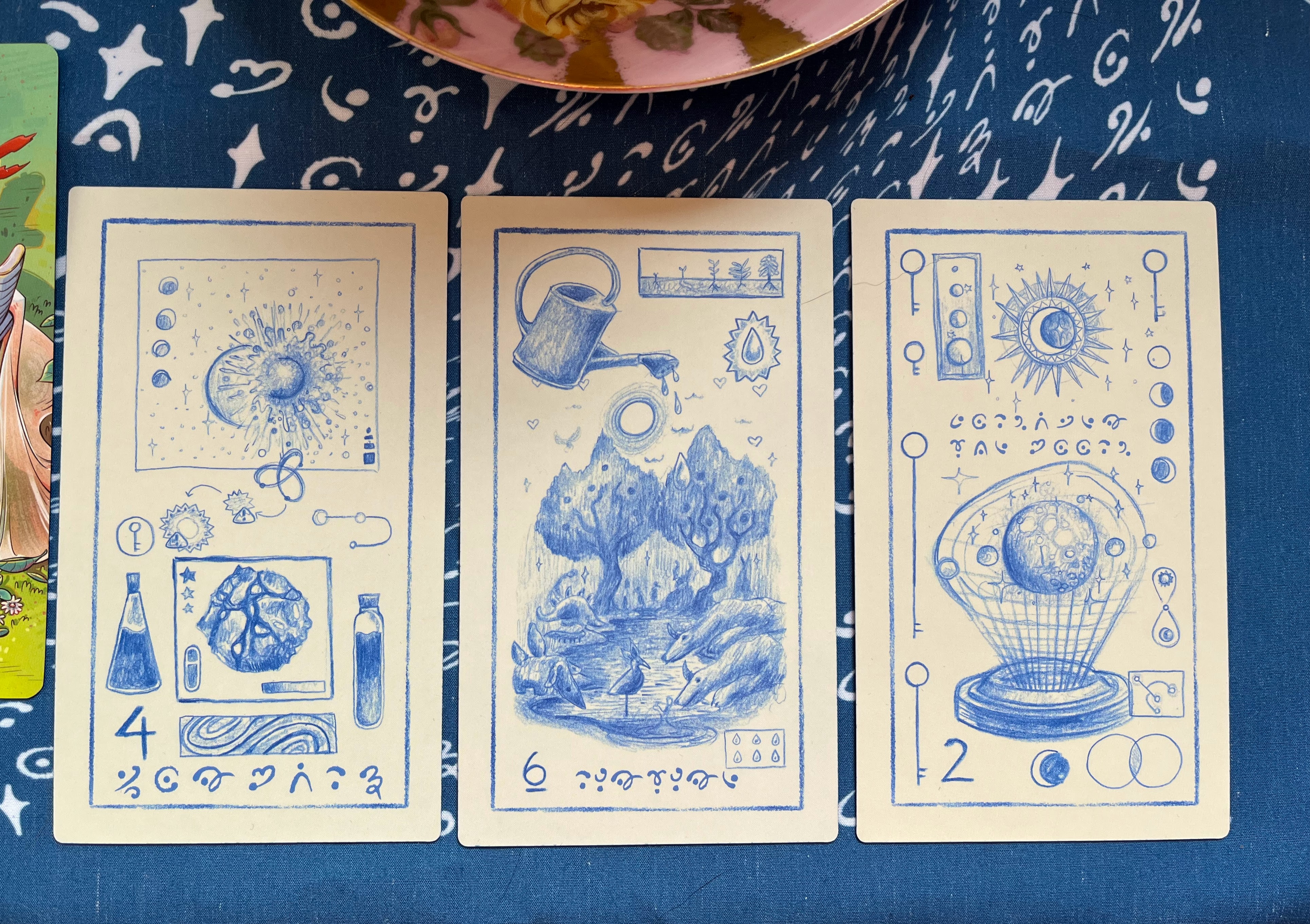 The first card, a 4, is very chemical looking isn’t it? We see what looks like a process of reactions, a sphere coming apart, the moon phases, vials of liquid, oscillating waves. The key words we have here are Stabilizing, Solidifying, Forming. The 6 card is much more scene-like, with a watering can watering the whole forest and ecosystem. We have repeat images of water drops along with a seed grow chart. Words associated with this card are Temperance (again!) Philanthropy, Reserve Love, “Soft Like Water”. Our final card is a 2, with multiple moon images and keys (I won’t lie, I’m getting some serious High Priestess vibes from this one). Key words are Feminine Phase, Moon, Subconscious and Love.
