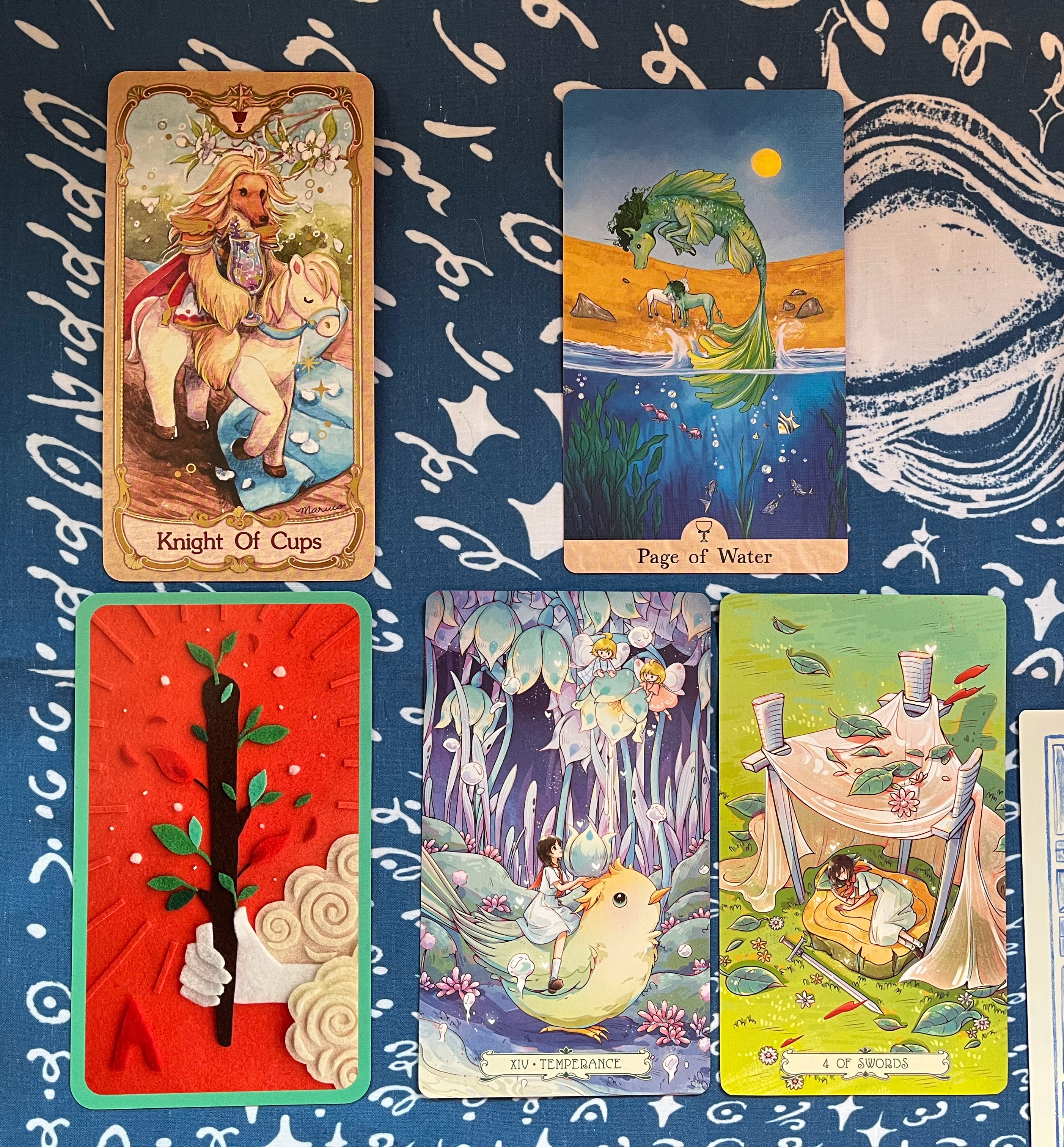 From the Animal & Food Tarot I drew the very charming knight of cups, which looks like an Afghan Hound on a cute little pony! This deck is not only cute, but it is an absolute fantastic take on the RWS that still holds traditional meanings but with the most playful twists! Of course, the knight of cups is the daydreamer, the die-hard romantic of the knights, the classic “knight in shining armor” who always comes with a gift. It’s also typically a knight I associate with the one who is in search of “the holy grail.” This one has some serious faith in their horse, as they are carrying a glass with a fancy beverage and asking the horse to walk over a blue tarp. I can attest, this is no easy feat!