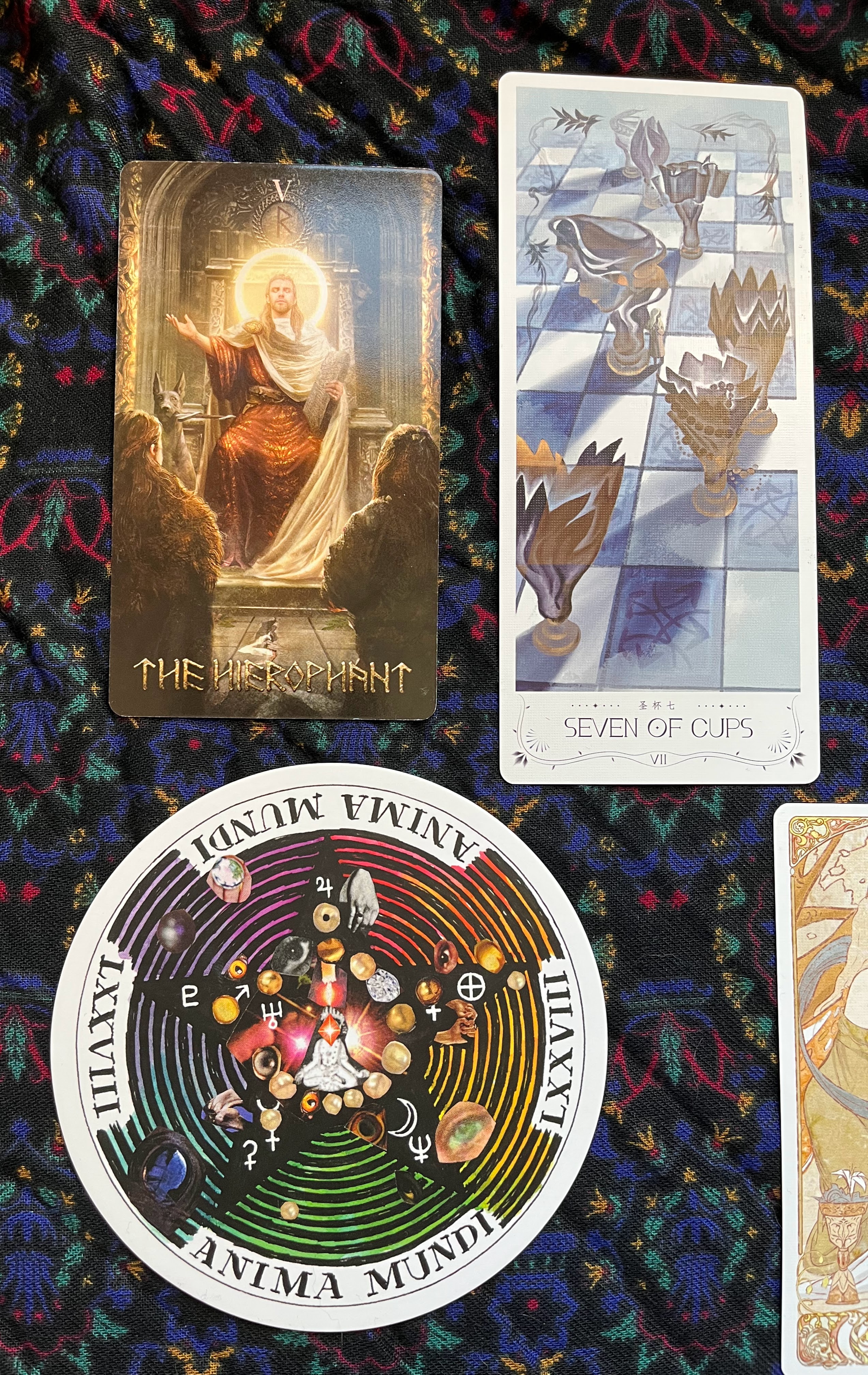 Well, seems like a troubled month is ahead. There’s a lot of discerning I need to do, to see what really matters vs what does not, what is an illusion, and what is real. With two sevens in this draw, there’s a critical turning point I’m wavering at. It seems like there is a whole lot of “everything, everywhere, all at once” feeling, and while there is a connection to the universe at large, there is also a looming figure that, while trying to look like they are kindly and giving and holy, are actually very oppressive (I mean, duh.). I get the sense I have to defend my position without looking like I’m on the defensive, as if I have to appear like I’m “at one” with the world, but really I’m planning for the long game. Woof.
