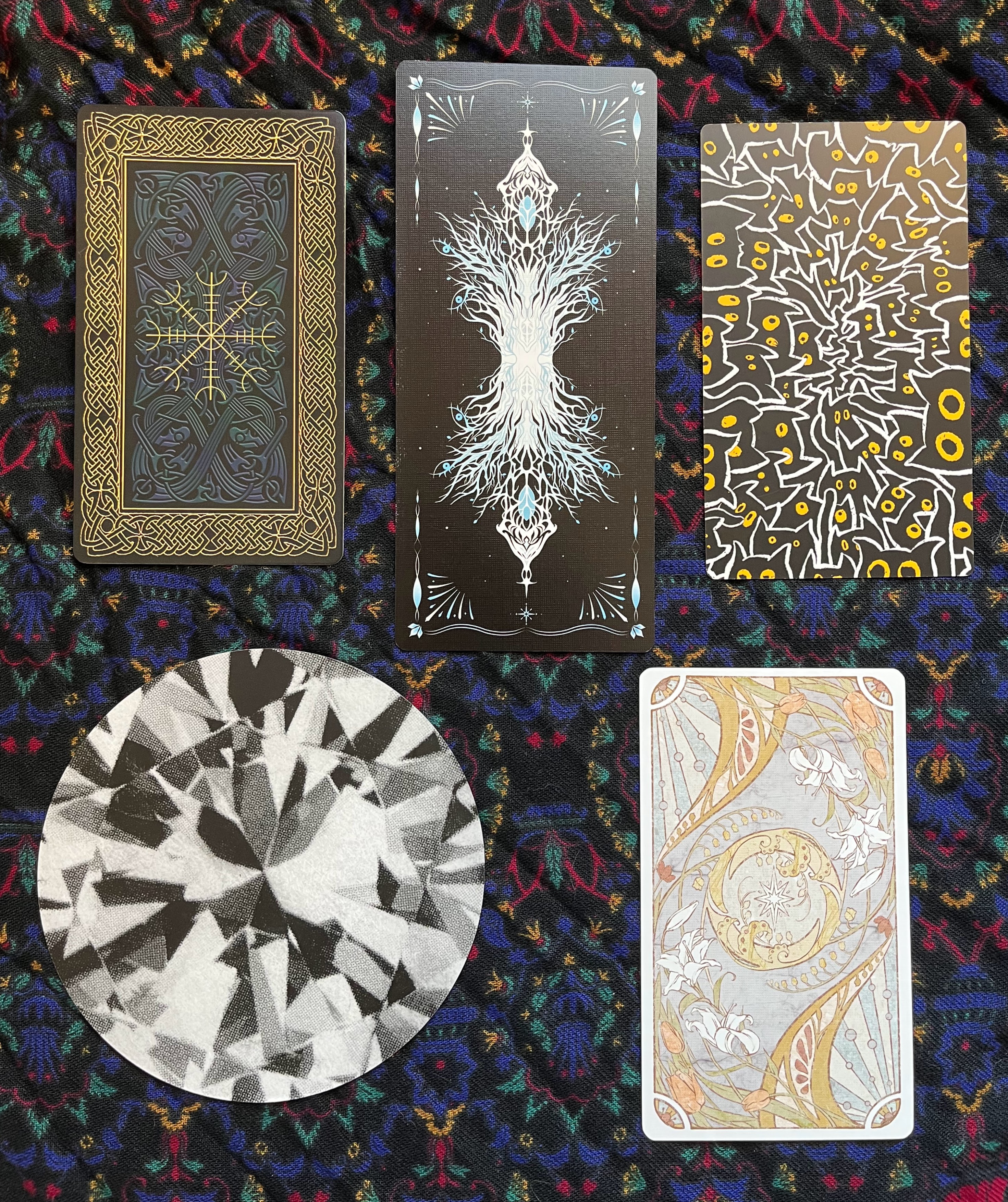 Moravia as my Cleric, Into the Void as the Bard, The Lighthouse in Fog as the Monk, Runic Tarot as the Barbarian, and The Wild Unknown Archetypes as my wizard. Arguably my strangest combination of decks yet!
