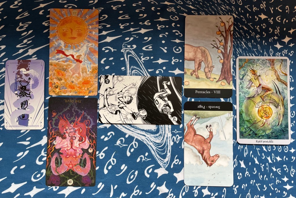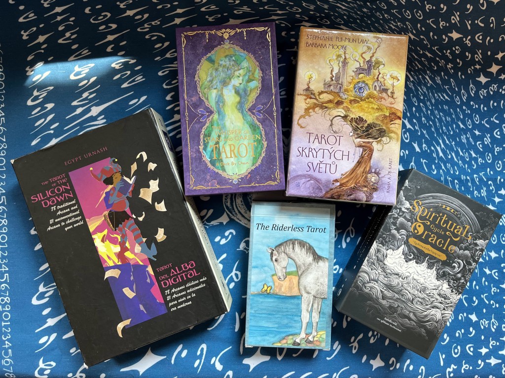 Right to left: The Tarot of the Silicon Dawn, The Whisper of the Stars and Garden Tarot (“Self” edition), Spiritual Cycle Oracle, The Riderless Tarot, the Shadowscapes Tarot (Czech Edition).