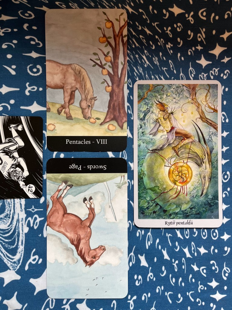 Hmm, and interesting set of three cards! On the far right is the Shadowscapes Knight of Pentacles, the card of “slow and steady wins the race,” unwavering diligence, and methodical work–certainly the most contemplative of the otherwise rash knights! This may be the year of the Knight of Pentacles seeing as I keep getting him. In the sense of movement, it seems like the wyrm he rides is looping back on itself though he looks forwards at his end goal—in what ways are the motions I’m taking not helping me progress? It also makes me think of X The Wheel of Fortune major card seeing as it speaks of a wheel of cycles the human experiences in their life.