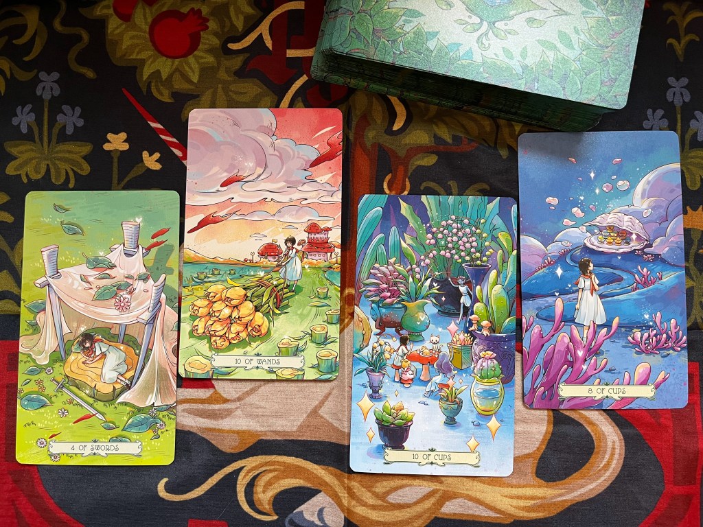 This very quirky deck, which I believe is from a Taiwanese artist(s?) and encompasses five different styles (one for each suit and one for the majors) was a complete spur of the moment purchase for me and I’ve been absolutely obsessed with it since. It’s an odd shape, and odd texture, the images while RWS are incredibly unique and it feels like the whole deck paints a story I wish I knew more about. If any of y’all know more about the origins of this deck, please share! The images are incredibly thought provoking and this deck has such a adventurous and completely unpredictable personality that it’s impossible to ever have a boring draw.