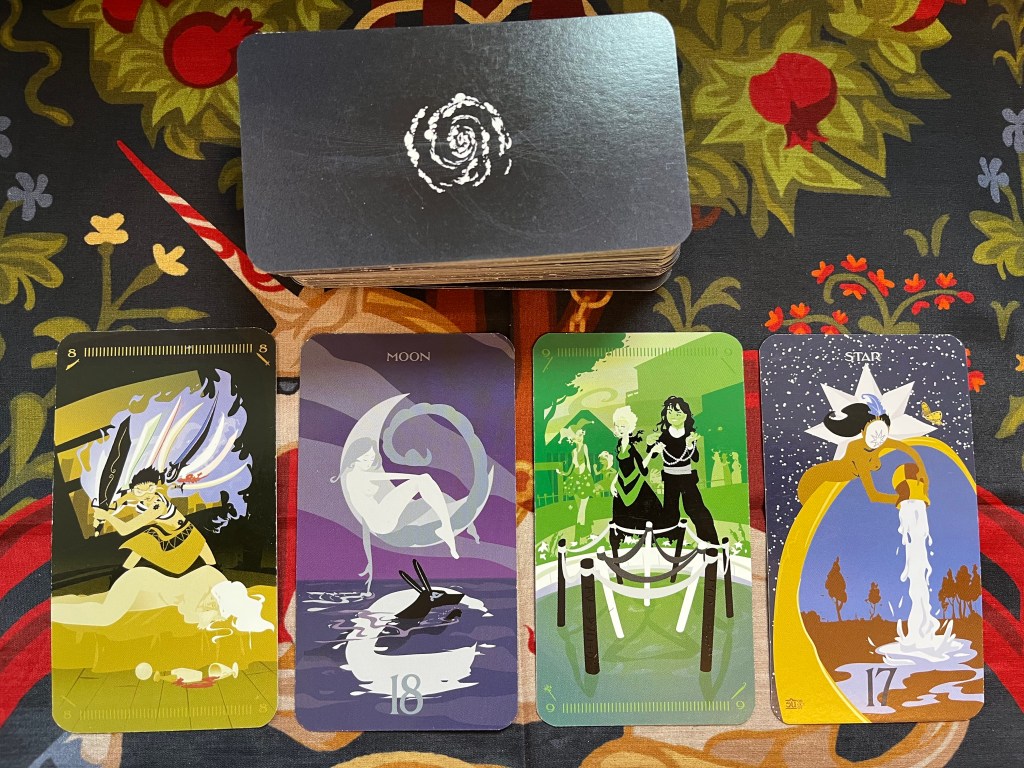 It took me nearly a year before I picked up and used in earnest the Exile Tarots, Silent and Awaken. At first blush they did not seem to come close to the artist’s other deck I am a huge fan of (the Monsoon Tarot), but once I started using these decks side-by-side, something really clicked into place. These decks use nearly the same artwork for each card except there are slight yet profound changes in the images that have a tendency to completely rewrite the card’s narrative, all while sticking true to the RWS. These decks (especially the Silent) are not afraid to go really dark. It seems all the more shocking when the characters appear to be very cute and soft. While one could use these decks separately, I find when I want to use them I combine them and see what happens. It’s a very different way for me to think of Tarot.