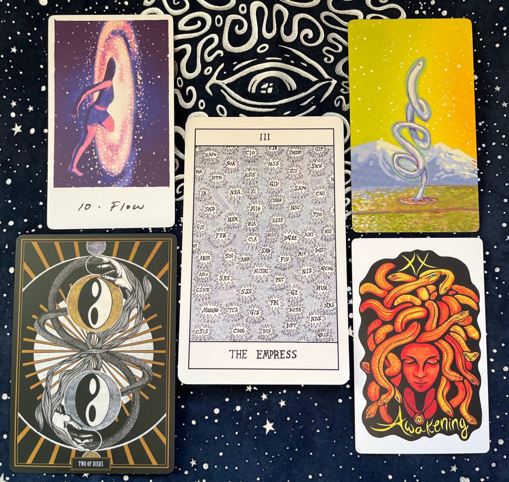 And then I feel like I need to address the wildly complex Hexen 2.0 Tarot (Suzanne Treister) which I find is far too often above me, and its the only deck I’ve use in which I feel a bit like an imposter when I am drawing cards from it. I’m using it in this monthly draw as my “oracle” card, but I almost did not write and publish this post because of this deck. Okay! Enough talk, let the cards fall! (er, jump, I guess)