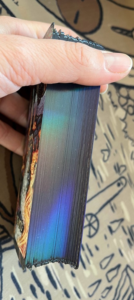 Card Quality: 5/5 Stellar. Matches its 6th edition brother deck. Flexible but still stiff enough to retain its shape, the colors are rich and printing is sharp, and the edging is probably my favorite with its rich blue-black rainbow holo. This is a sumptuous deck for sure, and the extra card isn’t the wrong size!