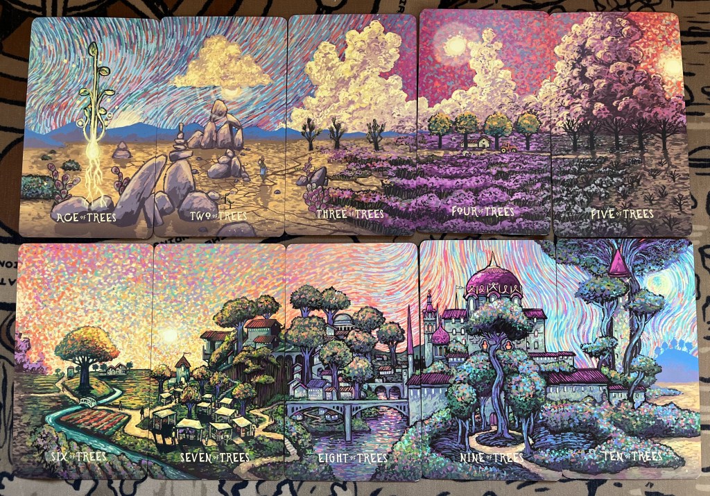 The minors also when laid out will make a continuous scene! It may feel a bit to “picturesque” but look closely and you will see hints here and there that give more meaning to the card (check out the skull-clouds in the Five of Trees).