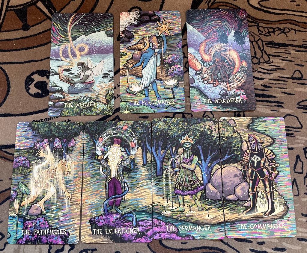 Some of the “court” cards, which are represented by these portrayals of various roles. Some roles, like The Peacemaker, The Entertainer, The Commander, make sense to me as I see this in everyday life, but others like The Weaver, The Wanderer, The Pathfinder, and The Geomancer I have no personal experience with and therefore feel like their meaning eludes me. But, it’s an intriguing take on the traditional courts! I see some idea of the Jungian Archetypes being portrayed in these court choices. Also, you can see all the courts will line up in a paneled story like the minors.