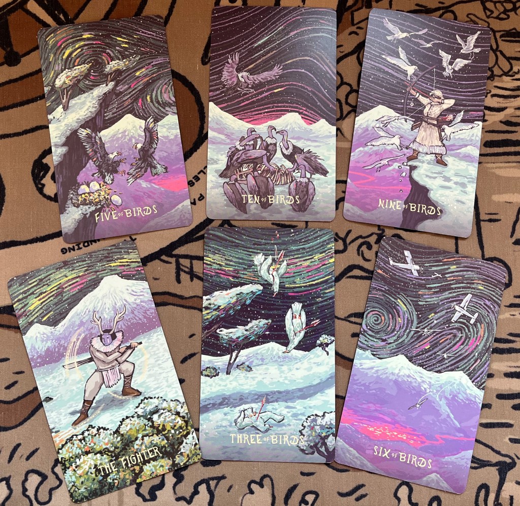 Least Favorite Card: I don’t have any, but I personally feel a bit sad that the art often in this deck views birds as challenging subject matter having birds in the early majors of this deck, and “The Suit of Birds” is a stand-in for the sword suit. I personally think very positively of birds, so some of the challenges of the swords are amplified (Five of Birds hits me hard) and others are blunted (Ten of Birds I see as a positive act of nature rather than a complete ending I typically associate with the Ten of Swords). This is perhaps why the artist chose to call this an “Oracle” verses a “Tarot” as there are these hard deviations.
