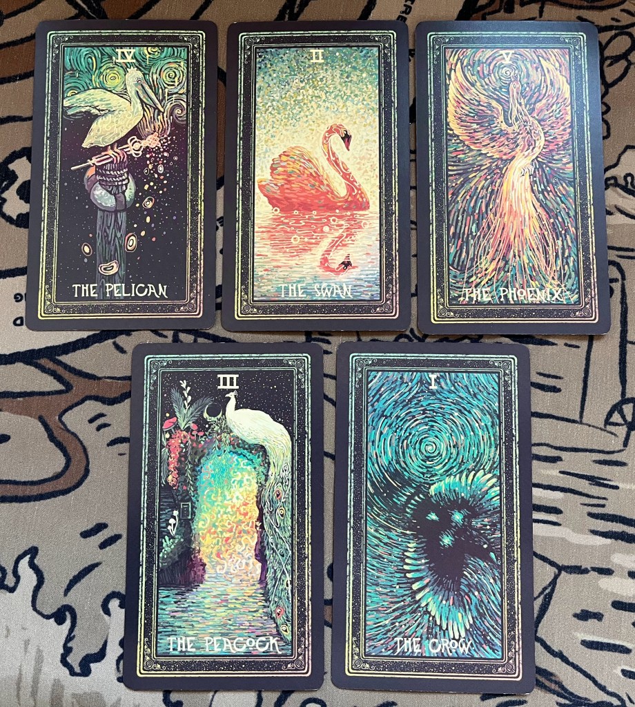 The “cycle of birds” as I call the early major cards. I am an avid birder so I really love this, but it is certainly quirky and can feel a bit removed as the imagery becomes more abstract in the later major cards.