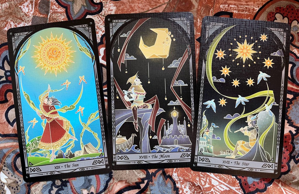 The deck is themed as if you are progressing past a series of stain glass motifs–but the images are supposedly reversed to the RWS, as if you’re looking at your own life story in a mirror. There’s so much play around this concept you can quickly get lost in all the extraordinary things going on in each card. There’s also a theme of time of day in each suite (and the majors), that adds a very interesting level of interpretation.