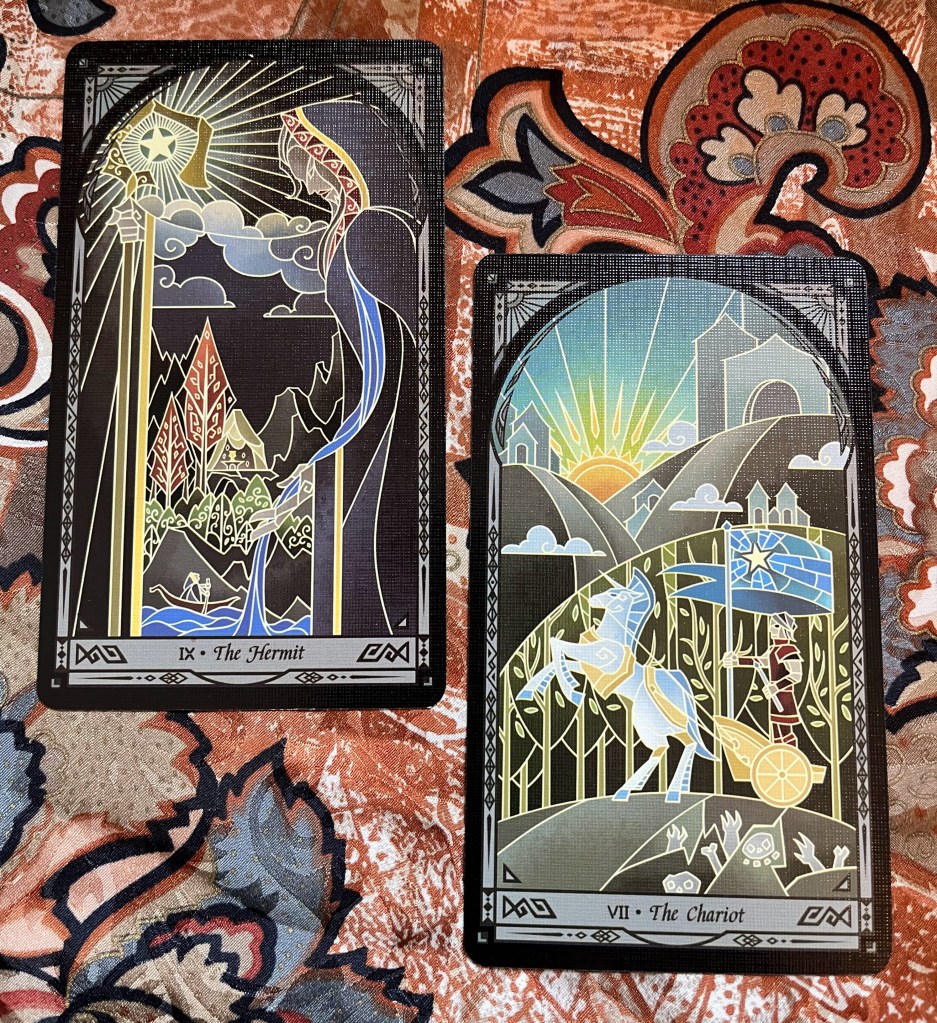 This deck feels particularly masculine without being broody, or in-your-face male. There’s a strong theme of the Hero’s journey, and there are many images grabbed from myths surrounding that journey. Its elegant, beautiful, bright, playful, and somewhat non-traditional but still approachable to the person who isn’t a confident reader. There are giants, maidens in distress, witches, heroes, figures of myth, musicians, all feeling like a 80/90’s “kids” movie pipe dream. It’s fun!