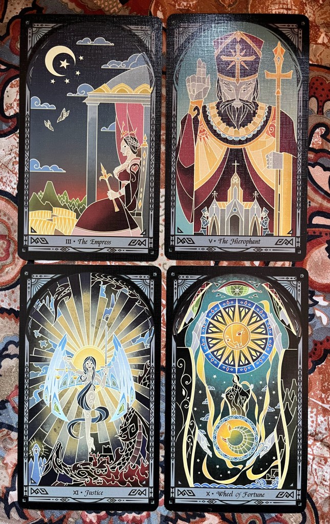 Least Favorite Card: The Empress, The Hierophant. There’s nothing wrong with either of them, they’re more standard RWS than most of the cards. Given the rest of the deck, I wanted something with a little more personality.
