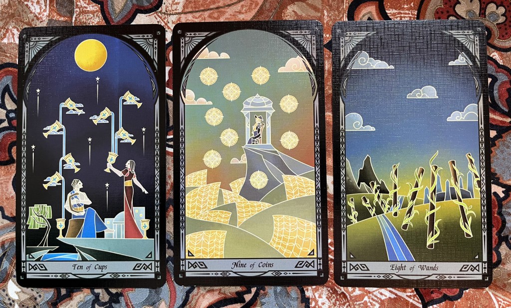 I love that this deck is both cool and silly. It feels like its really trying to be RWS but it refuses to totally commit! There’s a witch hanging out in a gazebo in the field and eight wands bouncing away like they’re brooms out of Disney’s Fantasia. It’s masculine whimsy.