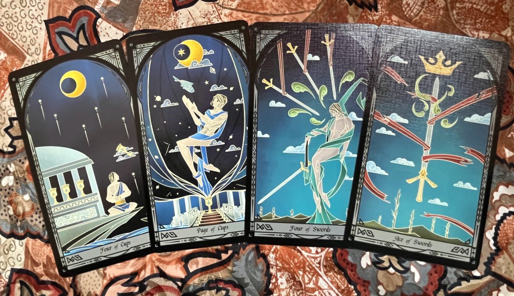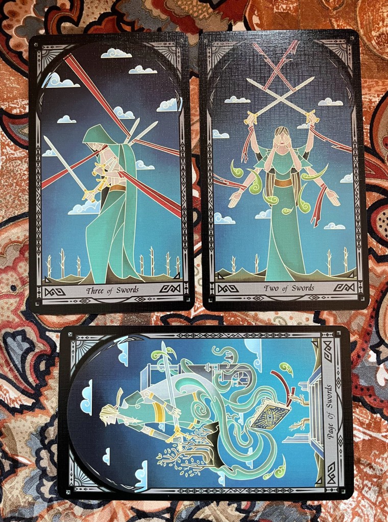 I will say a word of warning: the suite of swords is highly metaphorical–the red ribbons representing the thoughts that tie you down. This kinda blindsided me in my first few readings, but after working with this deck for several years it feels right in its own strange way.
