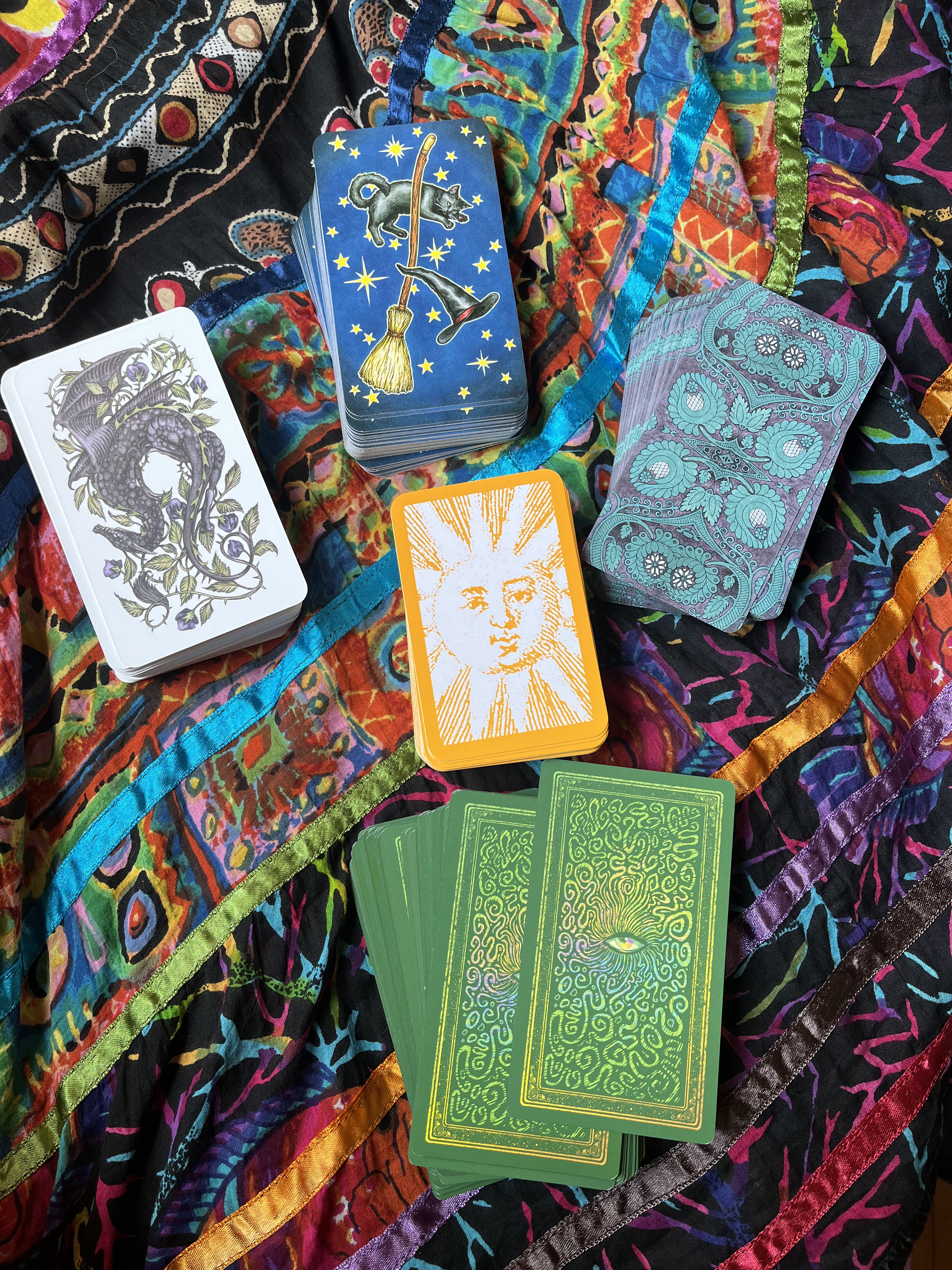 From top, clockwise, Everyday Witch Tarot, Tarot of the Dream Enchantress, Cosma Visions Oracle, Smoke, Ash & Embers. Center Oracle of the Radiant Sun