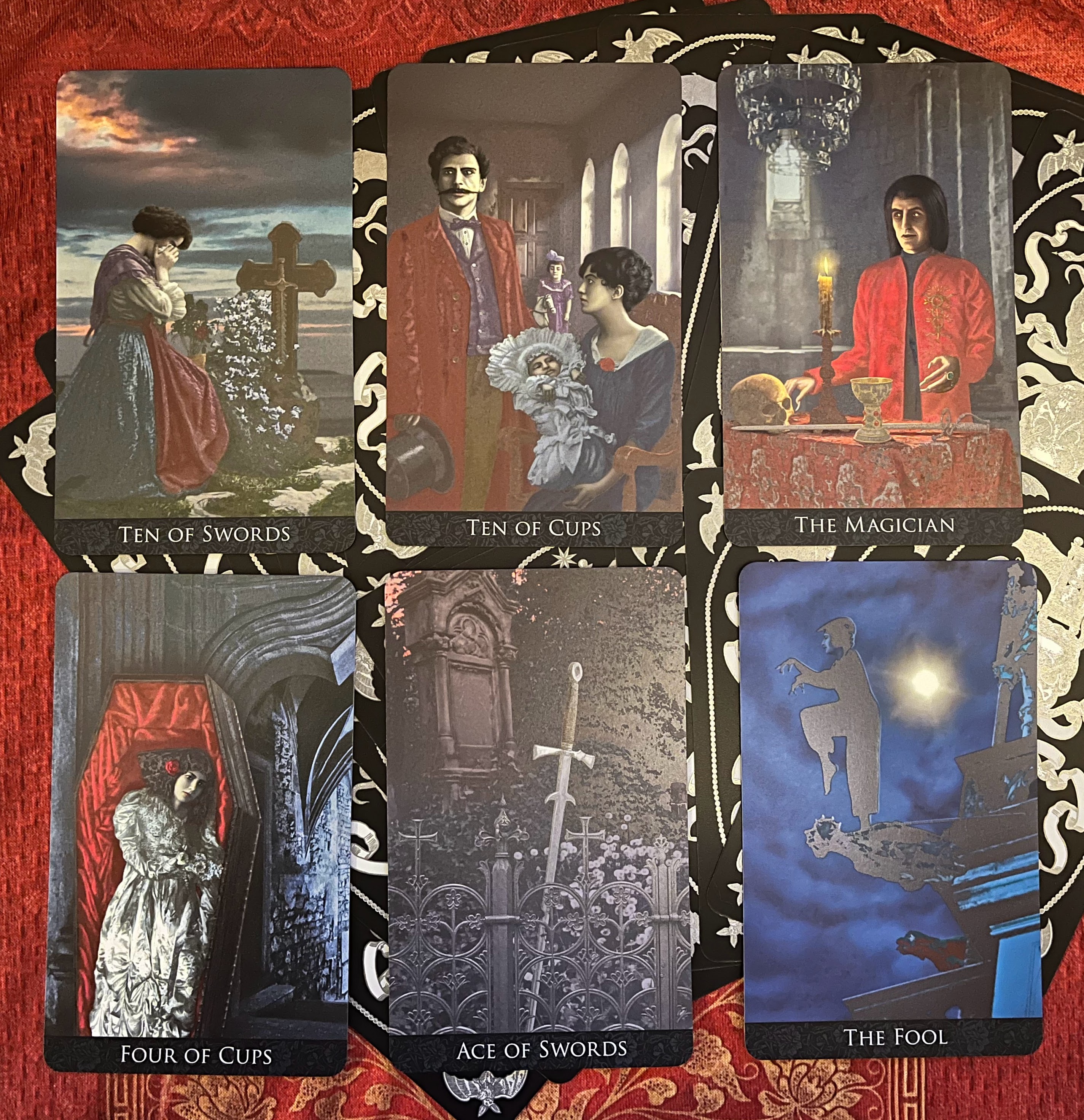 I was such a wanna-be-goth kid when I was in middle and high school! This deck would have been teen me’s perfect deck and I love it for that! It seems to encompass a gothic story in its images and there are various people who reappear in multiple cards over and over. The time and place are very fluid and undefined (could be anywhere from early medieval to early modern judging from the clothing), and the whole “story” is seems a bit fast and loose with the details, but I love it all the more because that’s how teen me would have made such a deck.