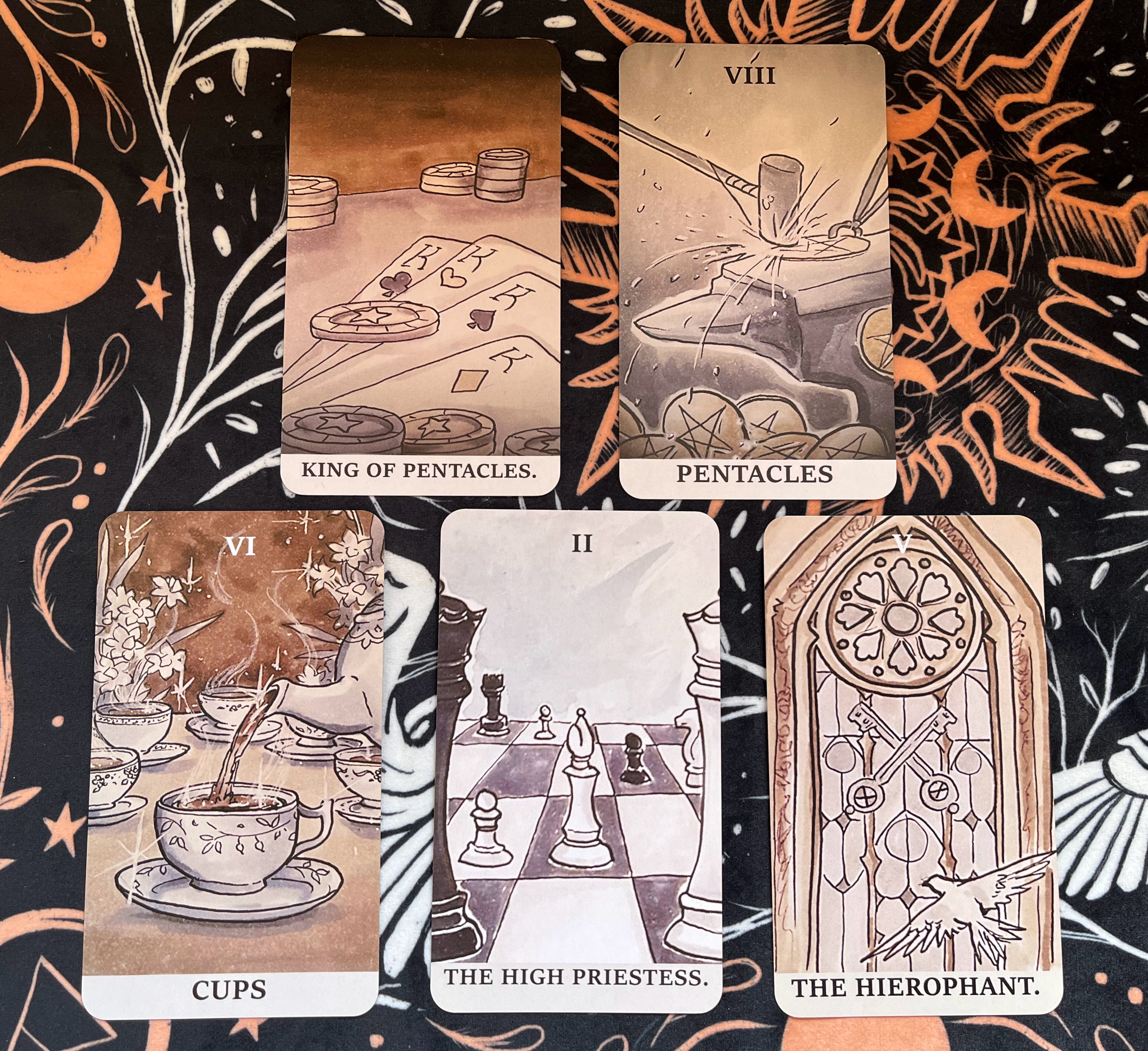 I must say, this is NOT AT ALL a deck that is going to give you the warm fuzzies–even the 10 of Pentacles, a classic warm fuzzies card, also portrays this family’s secret of the abuse of the black sheep. There is no ugly side of society that slips by this deck; you cannot escape your inner demons with this one. Like a wicked comedian, this deck will get under everyone’s skin. You can totally make a story out of even a short spread, which is lovely.