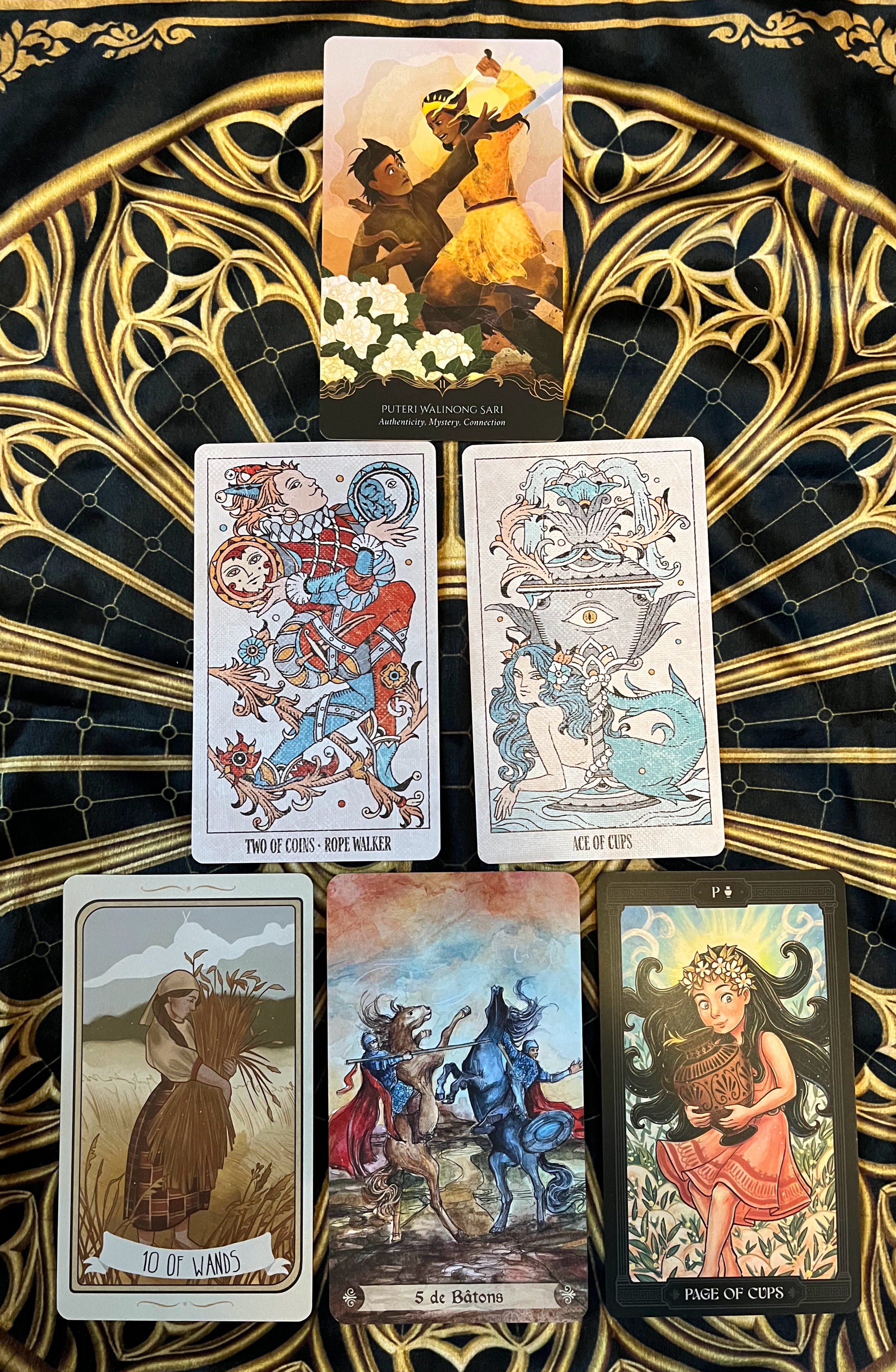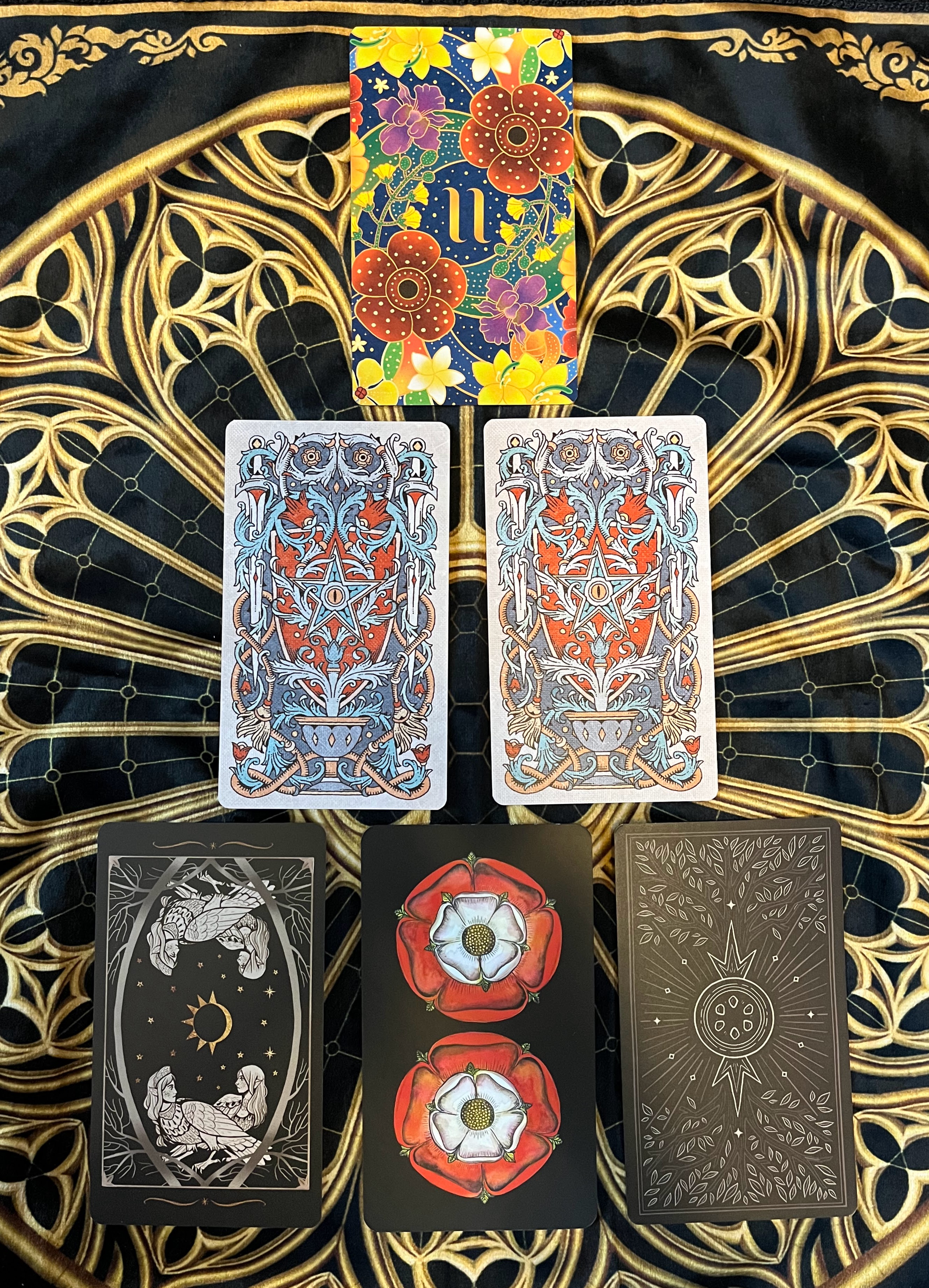 The creators of this deck, in case you are unfamiliar, are very inclusive of esoterica from around the world, so every time I draw a card and read the book I do feel like I’m learning and improving my tarot. The edition of a fifth minor arcana (Vessles, representing aether, or the spirit of self) also really makes me use my noggin when drawing from this deck!