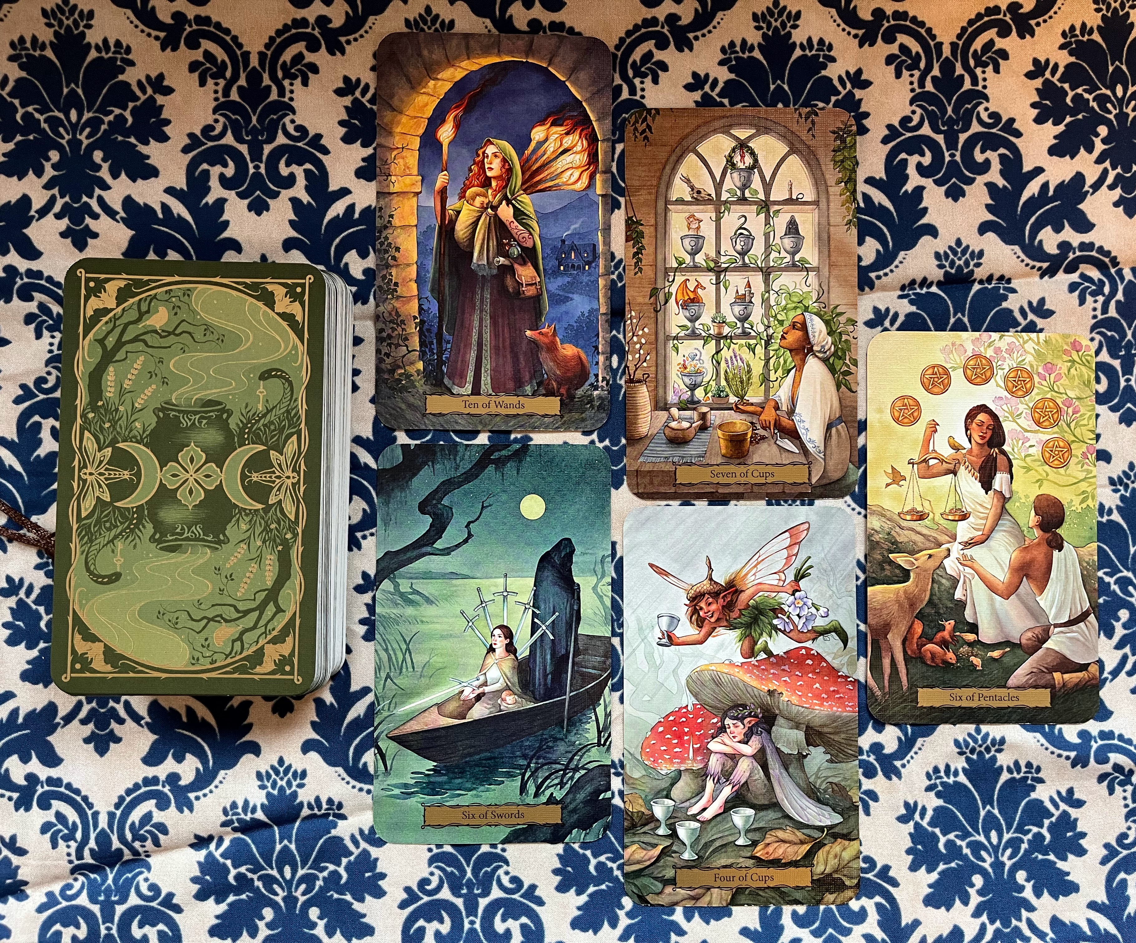 Art: 5/5 I typically don’t care for collage decks, but I’ll make an exception for The Enchanted Tarot. I am particularly drawn to the Art Nouveau/Orientalist style a lot of these cards have. The fabrics in the tapestries really make these feel rich, layered and just sumptuous. I know a few years back The Textured Tarot was having a moment, but to be perfectly honest I feel this deck has a lot more texture to the images, and it reminds me that one day I’d love to have an actual fabric Tarot deck in some shape or form. I have a bit of a love/hate relationship with the fact that the images are of people all over the historic spectrum and I struggle to have a mental “place” where I feel the setting of this deck occurs. In this sense The Ink Witch Tarot is very reminiscent of The Enchanted Tarot, but I feel there is a lot more story to each image with the Enchanted/Z.F. which becomes a blessing and a curse in readings.