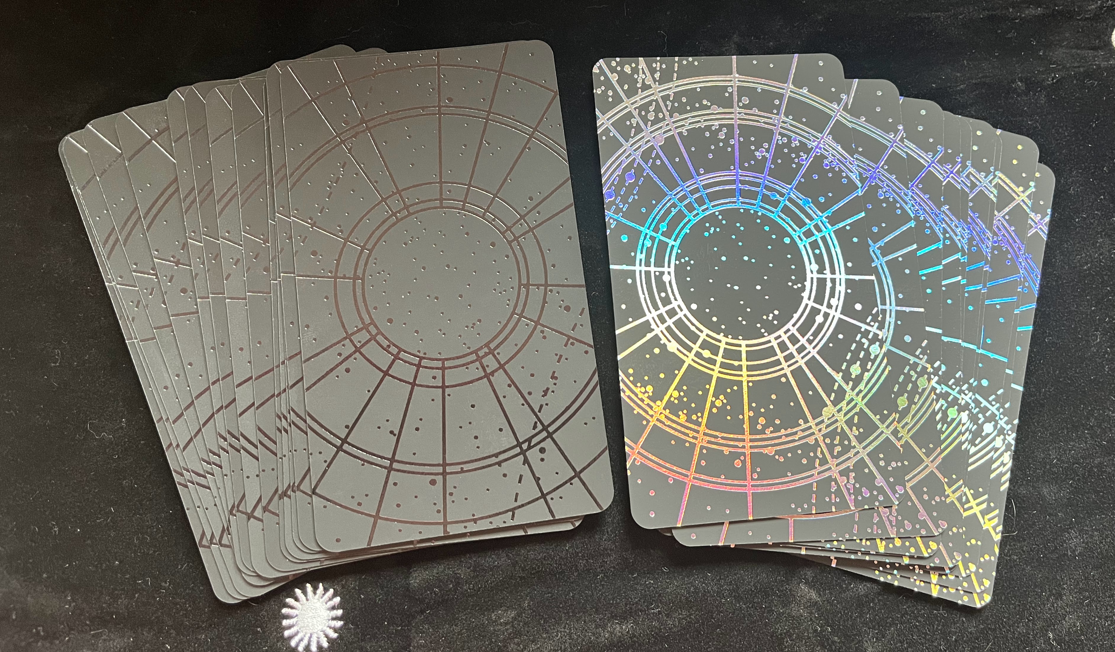 The almost mini size of the Zerner-Farber makes them more manageable, and the cardstock is quite a bit stiffer and they sport a matte gold edging that is really nice in hand. Overall they are the better quality card, but I do wish they were a larger size minus the dumb borders of the jumbo 25th. It would be nice in the future if they’d consider a lux print run with a black-cored center. I’ll never be happy with this deck, I think.